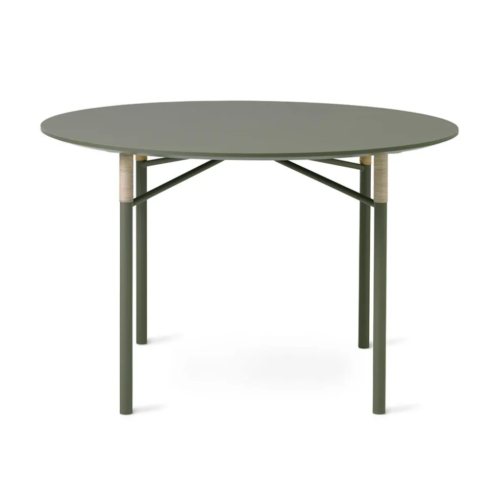 Der Tisch „Affinity“, entworfen vom preisgekrönten dänischen Duo Halskov & Dalsgaard, fängt einige der markantesten Merkmale der nordischen Möbelarchitektur in diesem einfachen Stück ein. Die Komponenten des Tisches stehen im Kontrast zueinander. Der rohe, pulverbeschichtete Stahl gibt dem Tisch einen strengen Look, der mit der weichen Linoleumplatte und dem organischen, peddiggrünen Rattan, das um die Beine geflochten ist, kontrastiert. Zusammen schaffen sie einen fast böhmischen Gesamteindruck, der perfekt in das moderne Zuhause passt.