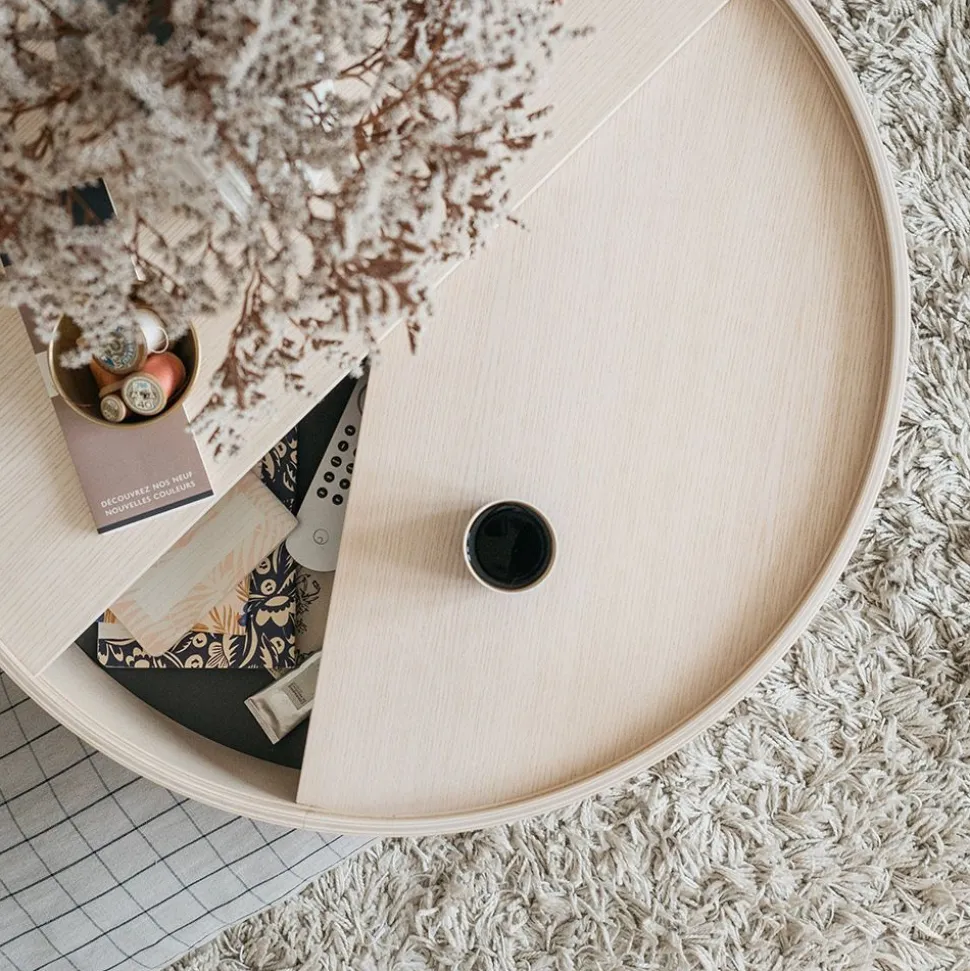 ARC Beistelltisch und Couchtisch wurden von Julie Begtrup und Ditte Vad entworfen. Der Name leitet sich von dem mathematischen Konzept einer glatten Kurve ab, die zwei Punkte in einem Kreis verbindet. Die Tische verfügen über funktionale Merkmale, die den Benutzer zur Nutzung anregen. Sie können den oberen Tisch leicht mit einem Finger öffnen. Die Tischplatte kann offen gelassen werden, um Ihre Lieblingssachen zu präsentieren, aber Sie können den Deckel auch geschlossen lassen, um die Dinge darin zu verstecken.
