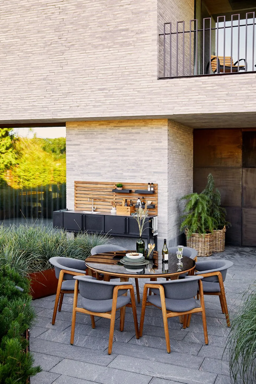 Die Aspect-Tische sind von entworfen. Die Tische werden mit einem Gestell aus Teakholz hergestellt. Die Tischplatte ist in Keramik oder Glas erhältlich. Das Tischgestell aus Teakholz bildet einen schönen Kontrast zu der Rohheit der Keramik der Tischplatte. Diese Tische sind für den Außenbereich gedacht und eignen sich perfekt für einen Lounge-Bereich auf der Terrasse. Das Teakholz kann unbehandelt belassen werden, aber wenn Sie die ursprüngliche goldbraune Teakholzfarbe erhalten wollen, können Sie es mit Teak Care behandeln.