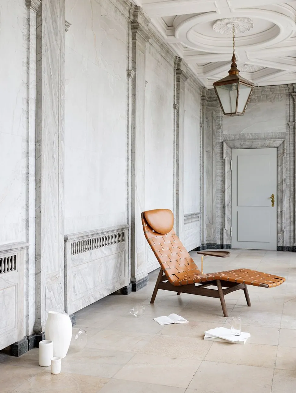 Die von der dänischen Architektenikone entworfeneAV Egoist Chaise Lounge ist ein Musterbeispiel für Vodders Fähigkeit, zeitlose und dennoch extravagante Möbel zu entwerfen. Das Gestell ist klassisch und elegant in schönem dunklem Holz gehalten, aber der Star des Möbelstücks ist die Sitzfläche – breite Lederbänder, die elegant geflochten sind, um einen bequemen Sitz zu schaffen, der sich dem Körper anpasst. Obwohl es sich um eine klassische Materialkombination handelt, schafft es Vodder mit seinen Techniken, das Stück wirklich einzigartig zu machen. Der integrierte Beistelltisch fungiert als natürliche Erweiterung der Natur des Möbels, bei dem die Entspannung und alles, was dazu gehört, im Mittelpunkt steht.