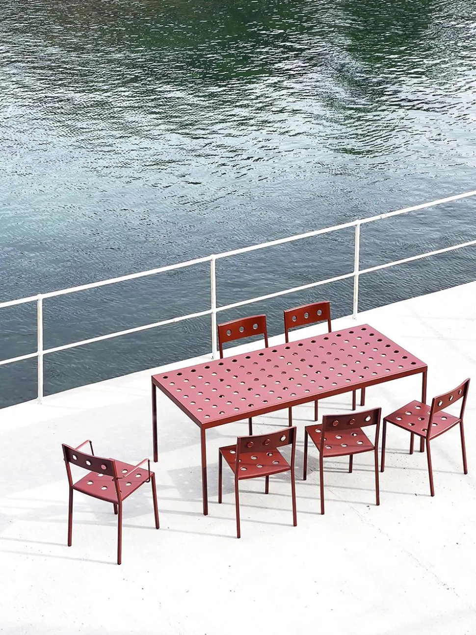 Balcony Table | Large, entworfen von Ronan & Erwan Bouroullec, ist Teil der Balcony Serie von . Balcony zeichnet sich durch sein elegantes und strenges Design in Verbindung mit den kreisförmigen Löchern in der Tischplatte aus und ist ein wesentlicher Bestandteil des Outdoor-Universums von . Die Möbel sind aus pulverbeschichtetem Stahl gefertigt, der für eine dauerhafte, wind- und wetterfeste Oberfläche sorgt.