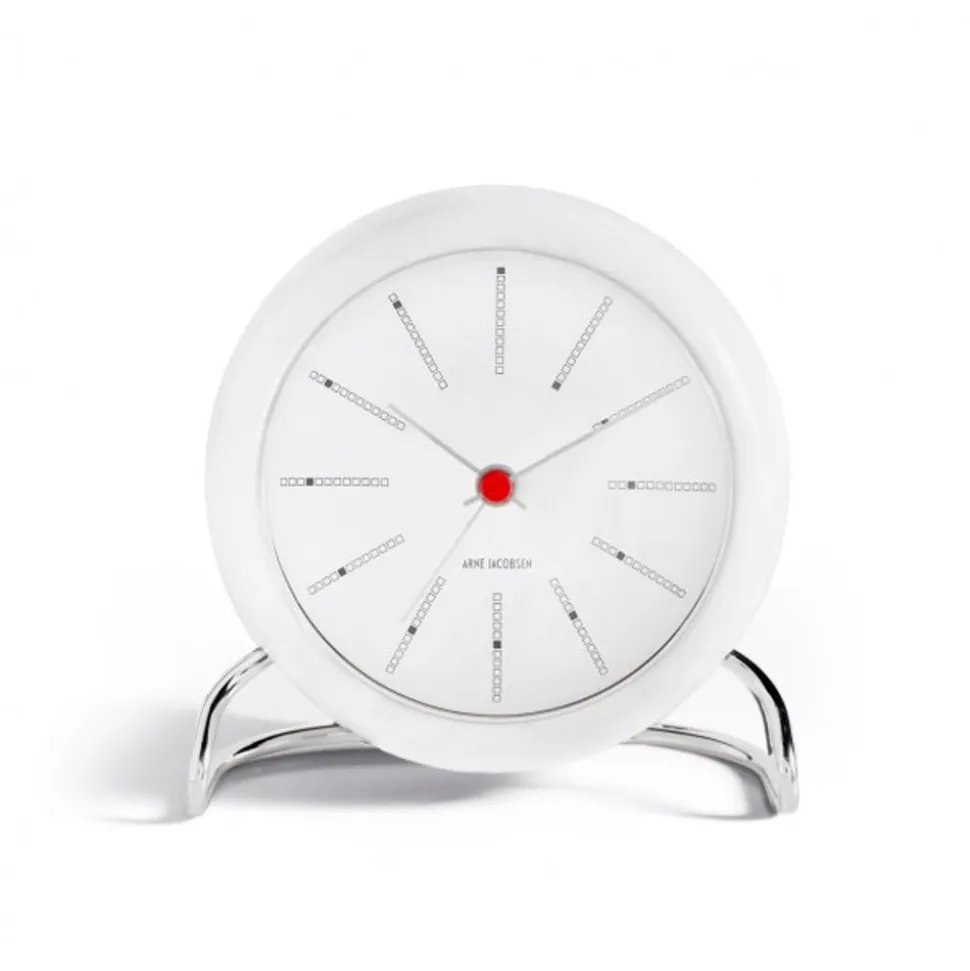 gewinnt 1961 den Wettbewerb für die Dänische Nationalbank, und das Gebäude wird 1978, sieben Jahre nach seinem Tod, fertig gestellt. Banker’s Clock befindet sich in der Veranda und führt als Kathedrale fast 20 Meter hoch durch alle sechs Stockwerke des Gebäudes. Die Wände sind mit Marmor verkleidet, und etwas Tageslicht strömt durch schmale vertikale Fensterschlitze. Die Serie ist sowohl als Wanduhr als auch als Tischuhr erhältlich. Die Wanduhr ist in vier verschiedenen Größen erhältlich und wird mit ihrem klassischen und zeitlosen Design in jedem Raum bequem sein.