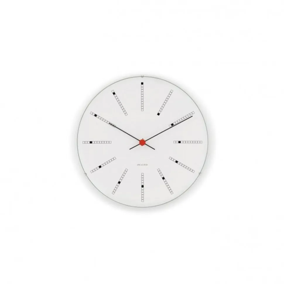 gewinnt 1961 den Wettbewerb für die Dänische Nationalbank, und das Gebäude wird 1978, sieben Jahre nach seinem Tod, fertig gestellt. Banker’s Clock befindet sich in der Veranda und führt als Kathedrale fast 20 Meter hoch durch alle sechs Stockwerke des Gebäudes. Die Wände sind mit Marmor verkleidet, und etwas Tageslicht strömt durch schmale vertikale Fensterschlitze. Die Serie ist sowohl als Wanduhr als auch als Tischuhr erhältlich. Die Wanduhr ist in vier verschiedenen Größen erhältlich und wird mit ihrem klassischen und zeitlosen Design in jedem Raum bequem sein.