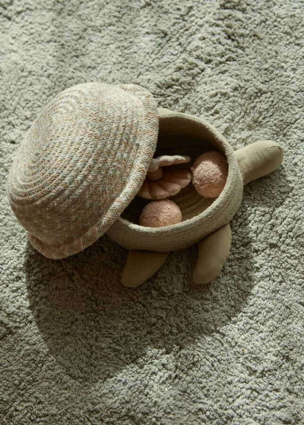 Der Basket Turtle von ist ein hübscher Aufbewahrungskorb für Kinder. Dieser Korb ist mehr als nur eine Aufbewahrungslösung – er ist eine niedliche und lustige Dekoration für jedes Kinderzimmer! Der Basket Turtle Baby & Mama ist aus einer geflochtenen Schnur aus 50% recycelten PET-Flaschen handgefertigt. Das Schild auf dem Schildkrötenpanzer selbst ist der Deckel für den Korb.