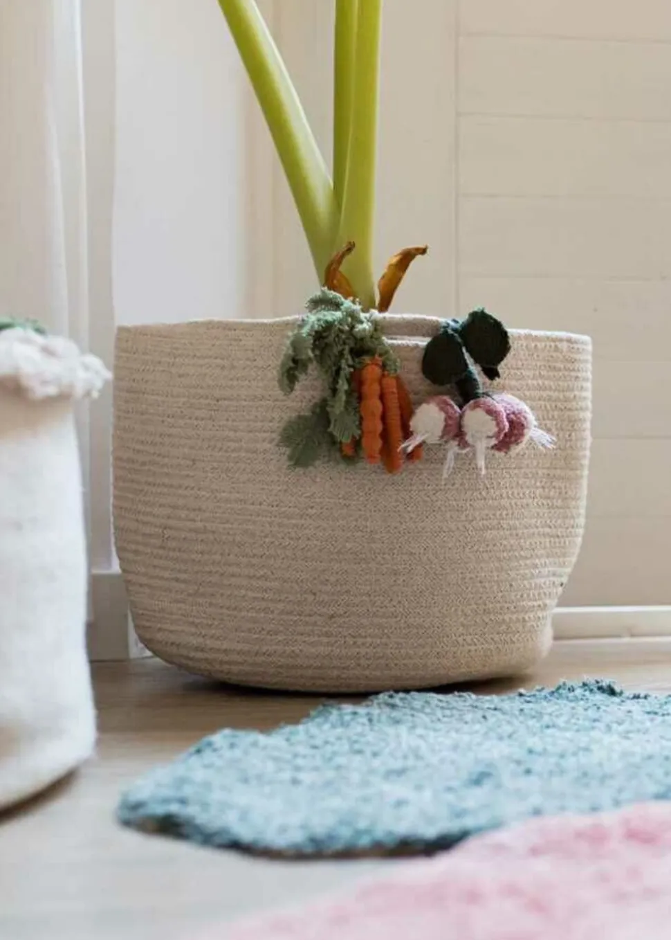 Basket Veggies von ist ein schöner und praktischer Korb, in dem man alles aufbewahren kann, von Pflanzen bis zu Spielzeug und Kleidung. Das Produkt ist Teil der Serie Oli&Carol. Der Korb ist aus Baumwolle handgefertigt und sehr pflegeleicht. Er hat eine fein gestrickte Textur. Wenn Sie den Korb kaufen, erhalten Sie nicht nur eine praktische und lustige Aufbewahrungslösung, sondern auch ein Kunstwerk. Das Design des Korbes ist von der Natur inspiriert und wird Ihr Zuhause und Ihr Leben bereichern.
