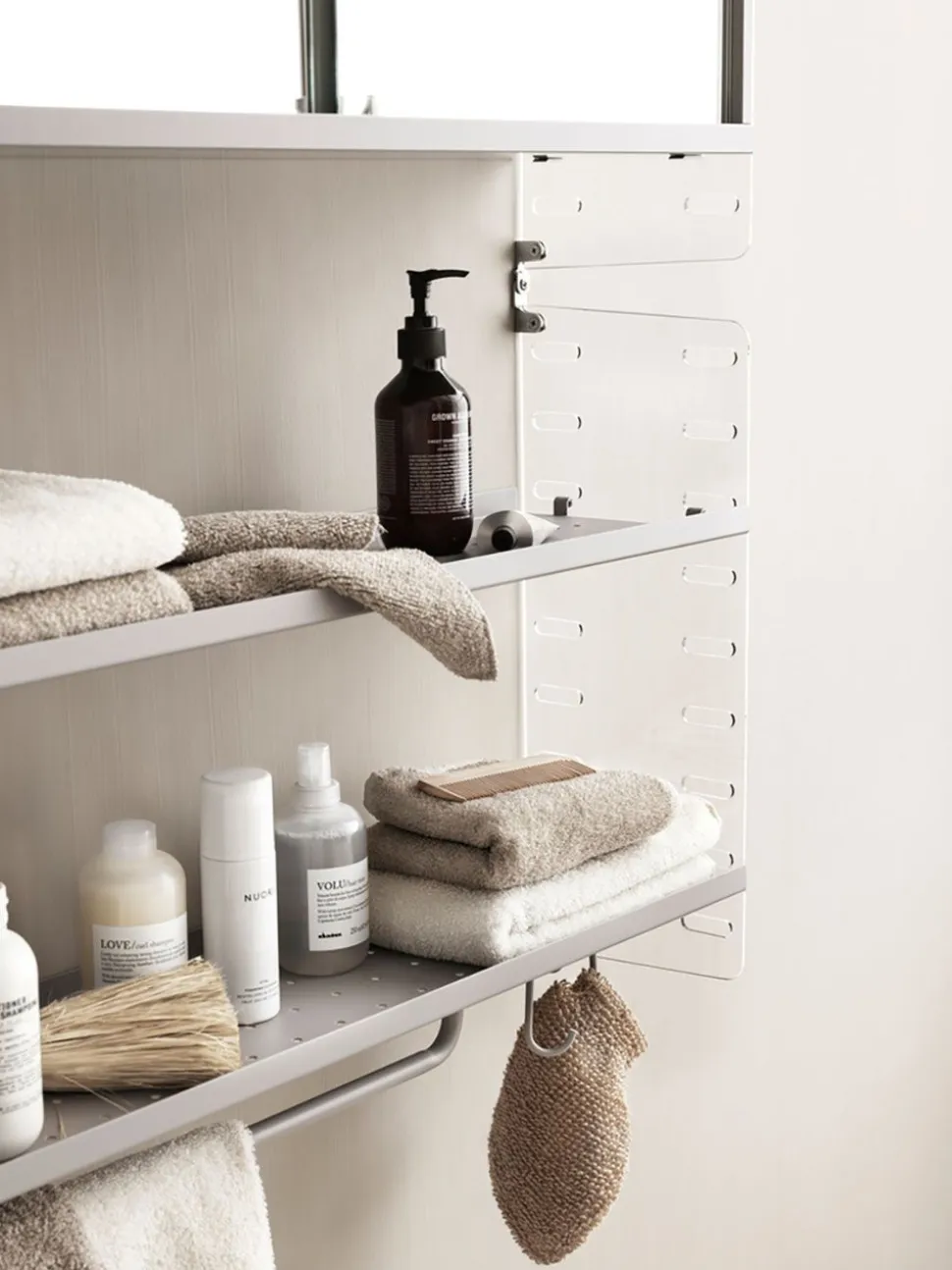 Erleben Sie die Kombination aus Eleganz und Funktion im Bathroom D von , das vom Kollektiv selbst entworfen wurde. Dieses Regalsystem ist eine Hommage an den Minimalismus, mit einer raffinierten Struktur, die jedem Badezimmer einen luftigen Look verleiht.