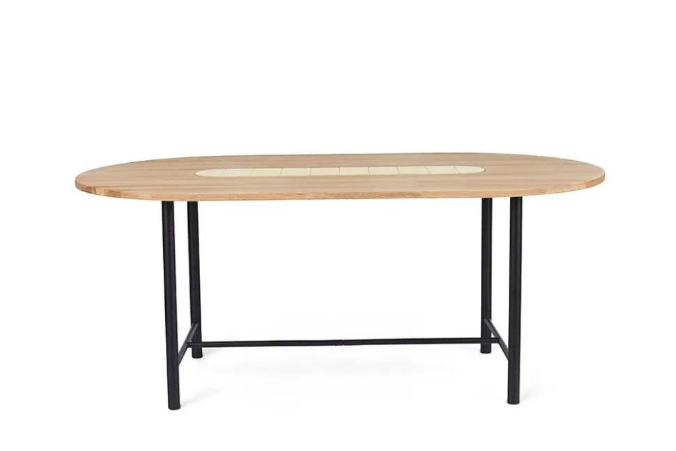 Die von der Dänin Charlotte Høncke entworfene Serie „Be My Guest“ basiert auf einem schlichten nordischen Design, das sich mit abgerundeten Kanten und einem leicht eleganten Rahmen an klassischen Referenzen orientiert. Das Gestell des Tisches besteht aus leichtem, pulverbeschichtetem Stahl, der mit der schweren Eichenplatte kontrastiert. Die Mitte der Tischplatte ist mit farbigen Kacheln verziert, die dem Tisch einen retro-modernen Look verleihen, der perfekt in ein nordisches Zuhause passt.