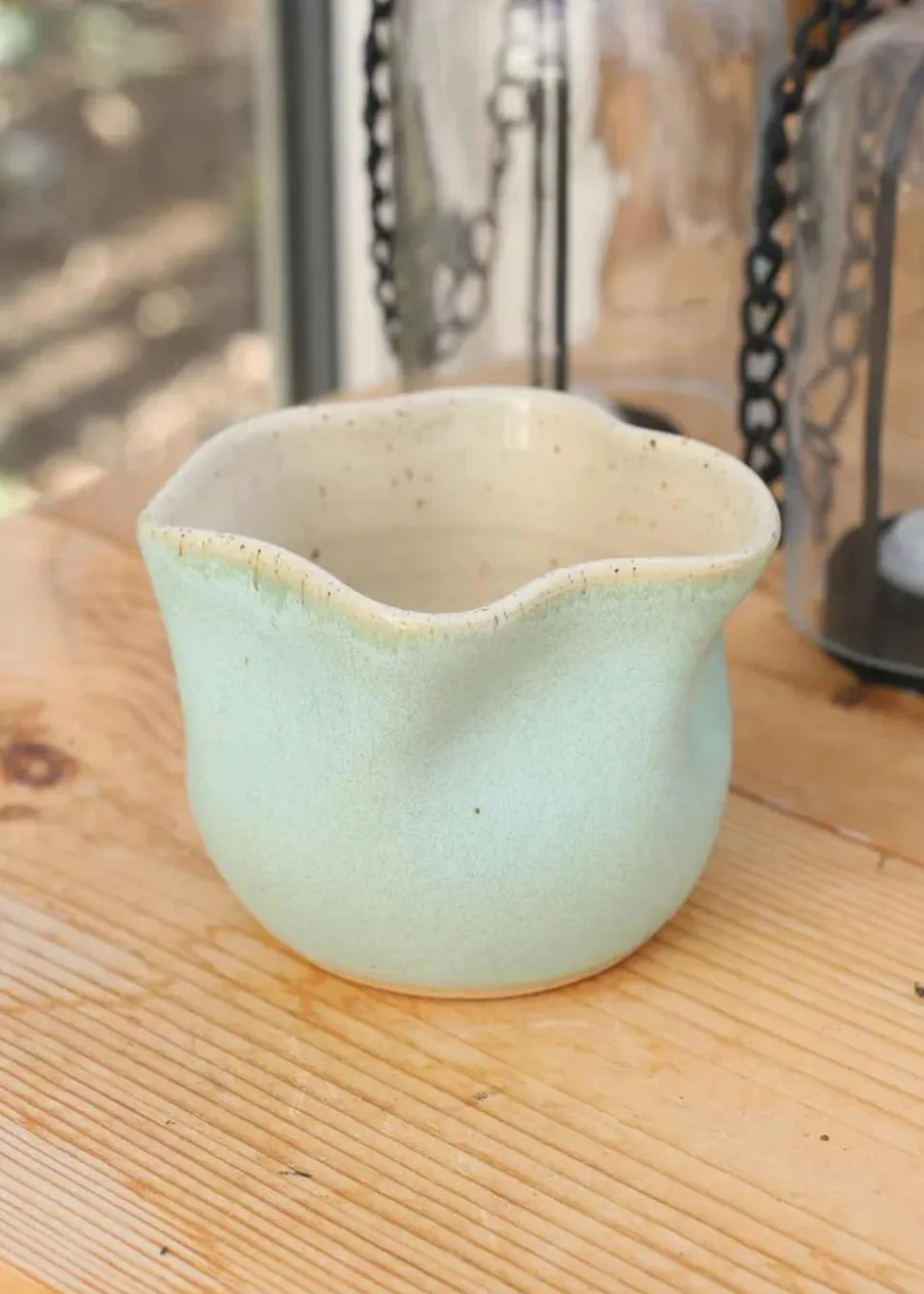 Der Spitzenbecher ist aus Steinzeugton handgedreht, von Hand geformt und in einem einzigartigen milden Grün mit Pinsel glasiert. Auf der Tasse sind kleine Lavaflecken im Ton zu sehen, die eine einzigartige Textur erzeugen. Die Größe der Tasse ist für eine Tasse Kaffee oder Tee geeignet und fasst etwa 325 ml.