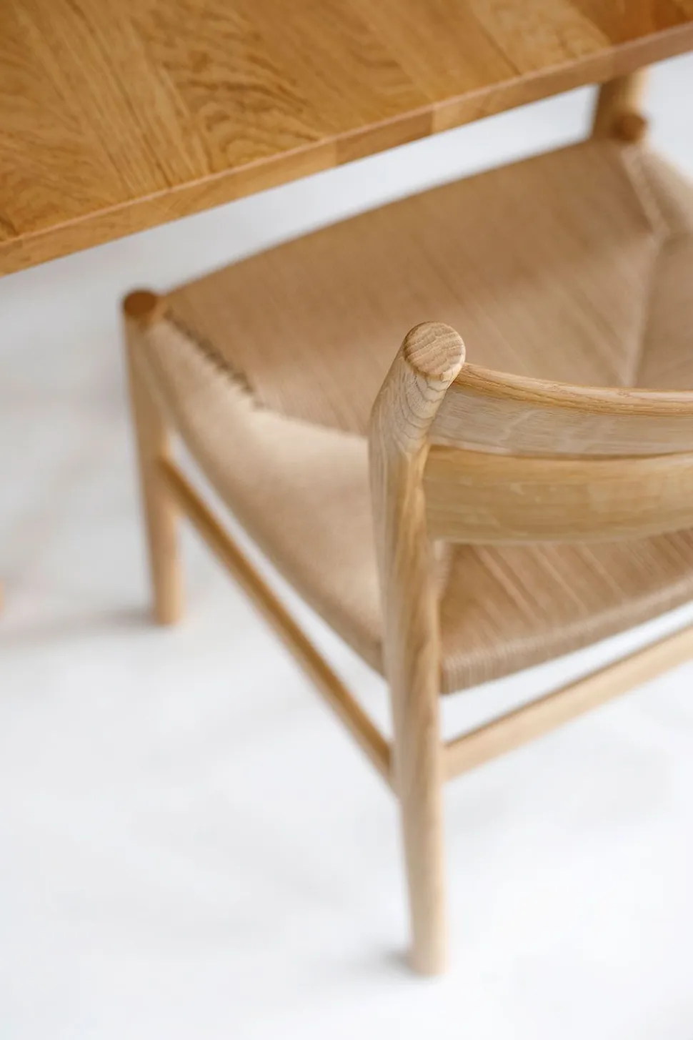 - Material: Aus Massivholz mit einem Gestell aus seifenbehandelter Eiche, geölter Eiche, schwarz lackierter Eiche oder geölter Räuchereiche. Die Sitzfläche besteht aus naturfarbenem oder schwarzem Papiergeflecht, das mit Seife und Wachs behandelt wurde und dadurch schmutzabweisend ist.