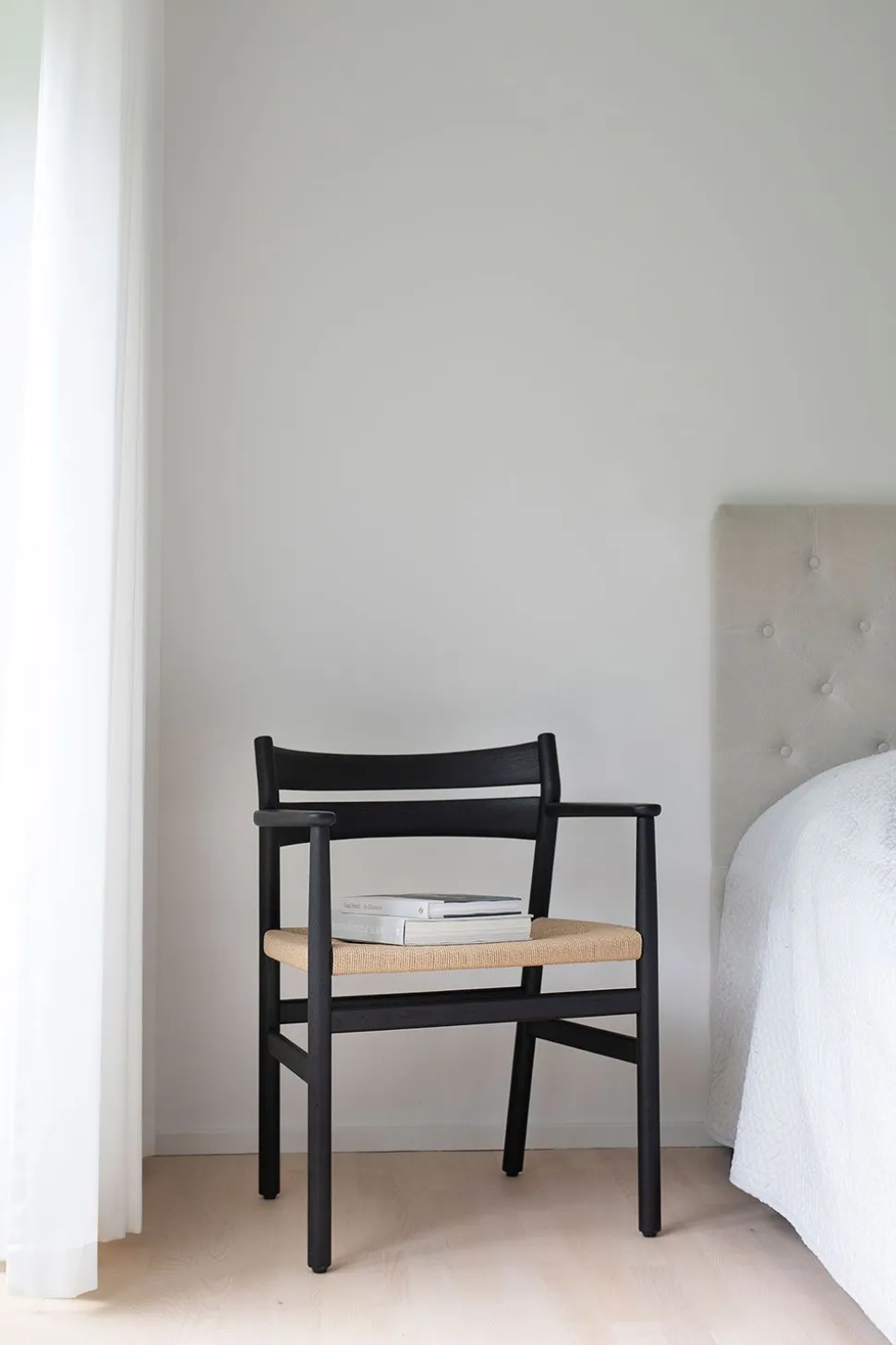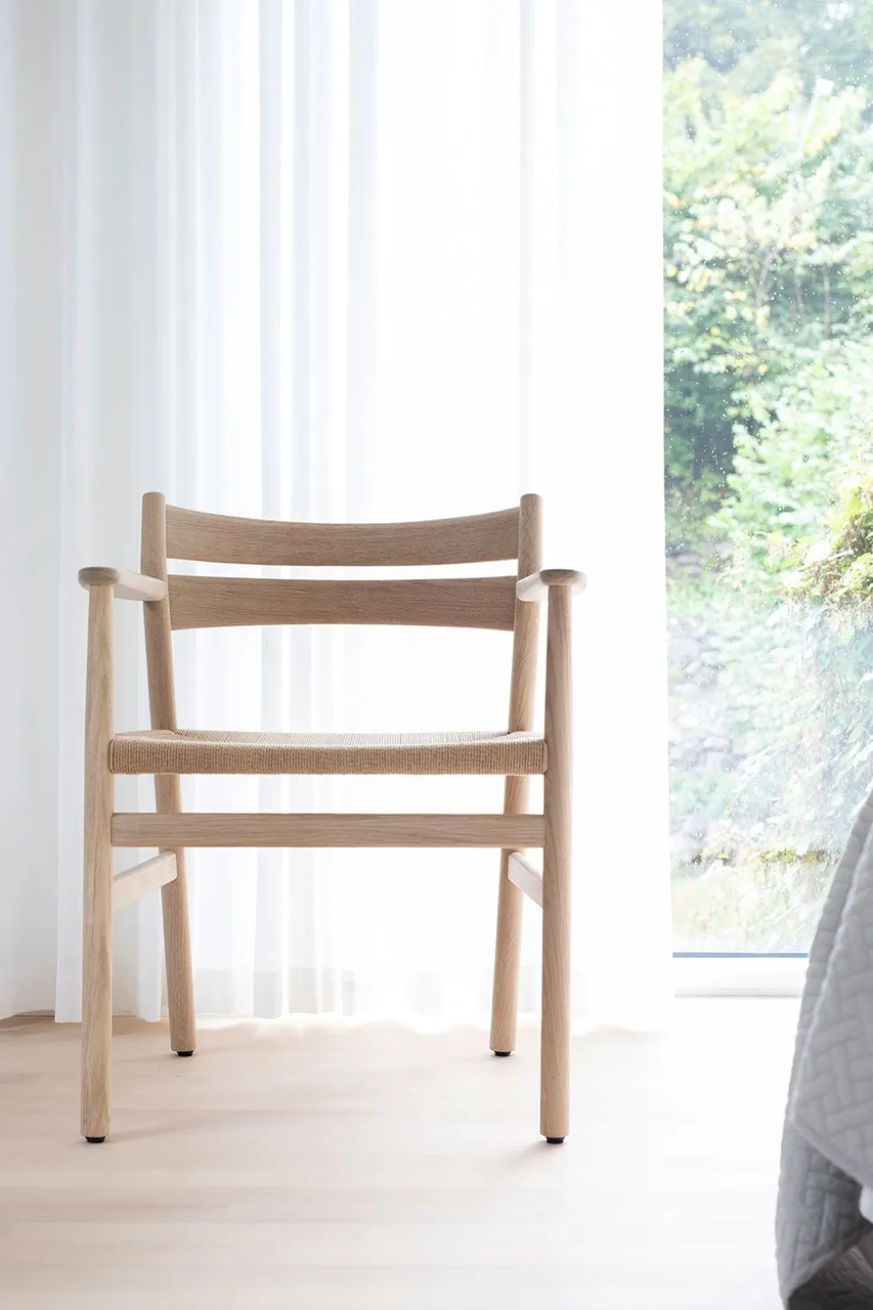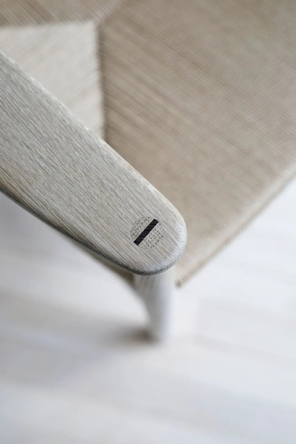 - Material: Massivholz in seifenbehandelter Eiche, geölter Eiche, schwarz lackierter Eiche oder geölter Räuchereiche mit schwarzem Furnier an der Armlehnenverbindung. Sitz aus naturfarbener oder schwarzer Papierkordel. Die Kordel ist mit Seife und Wachs behandelt, wodurch sie schmutzabweisend wird.