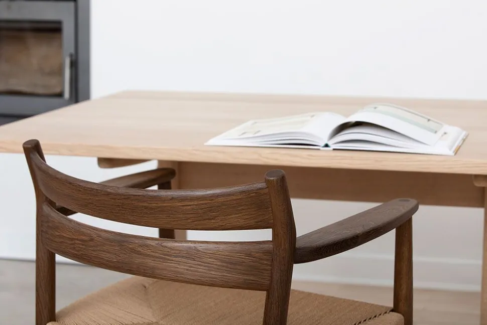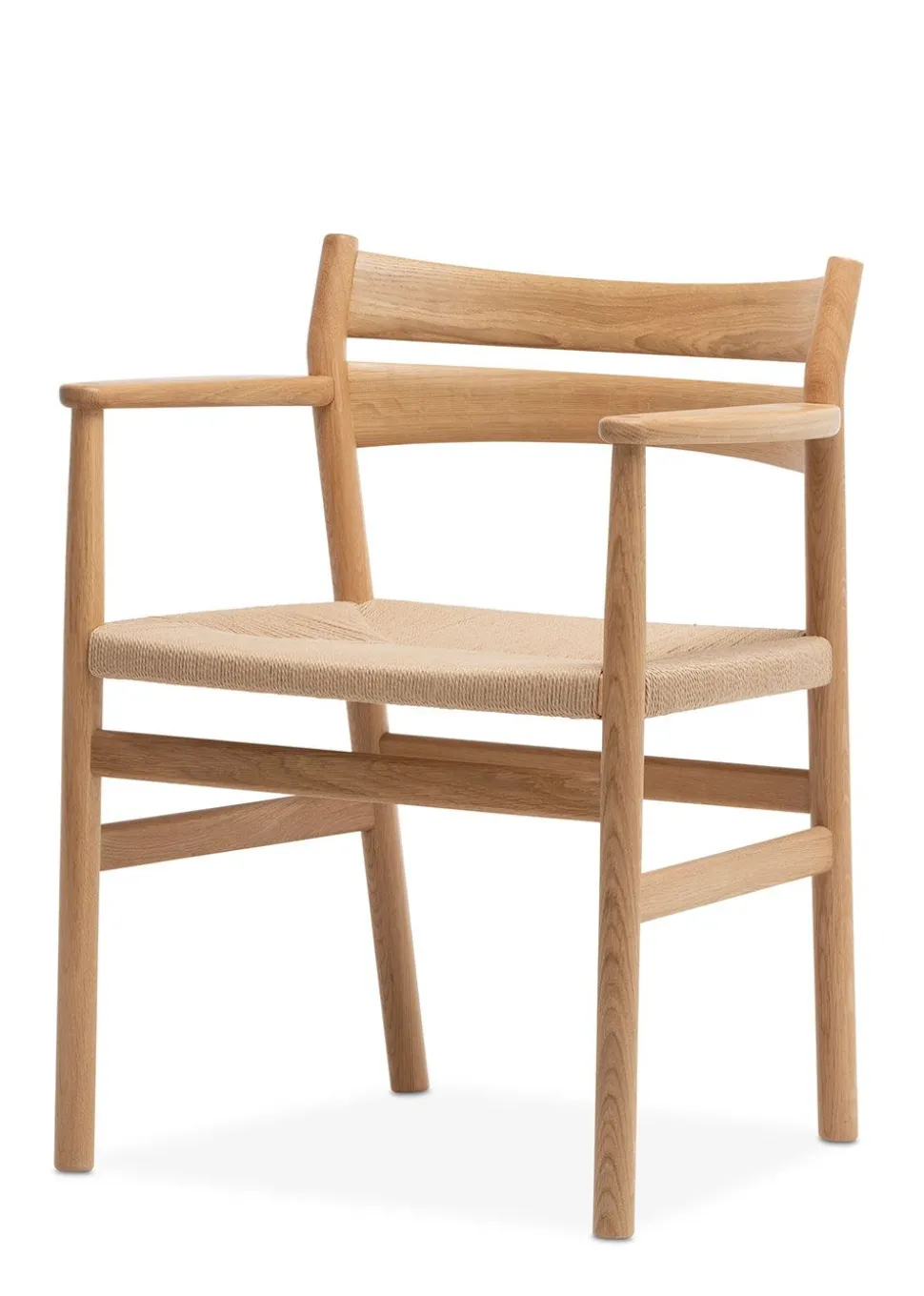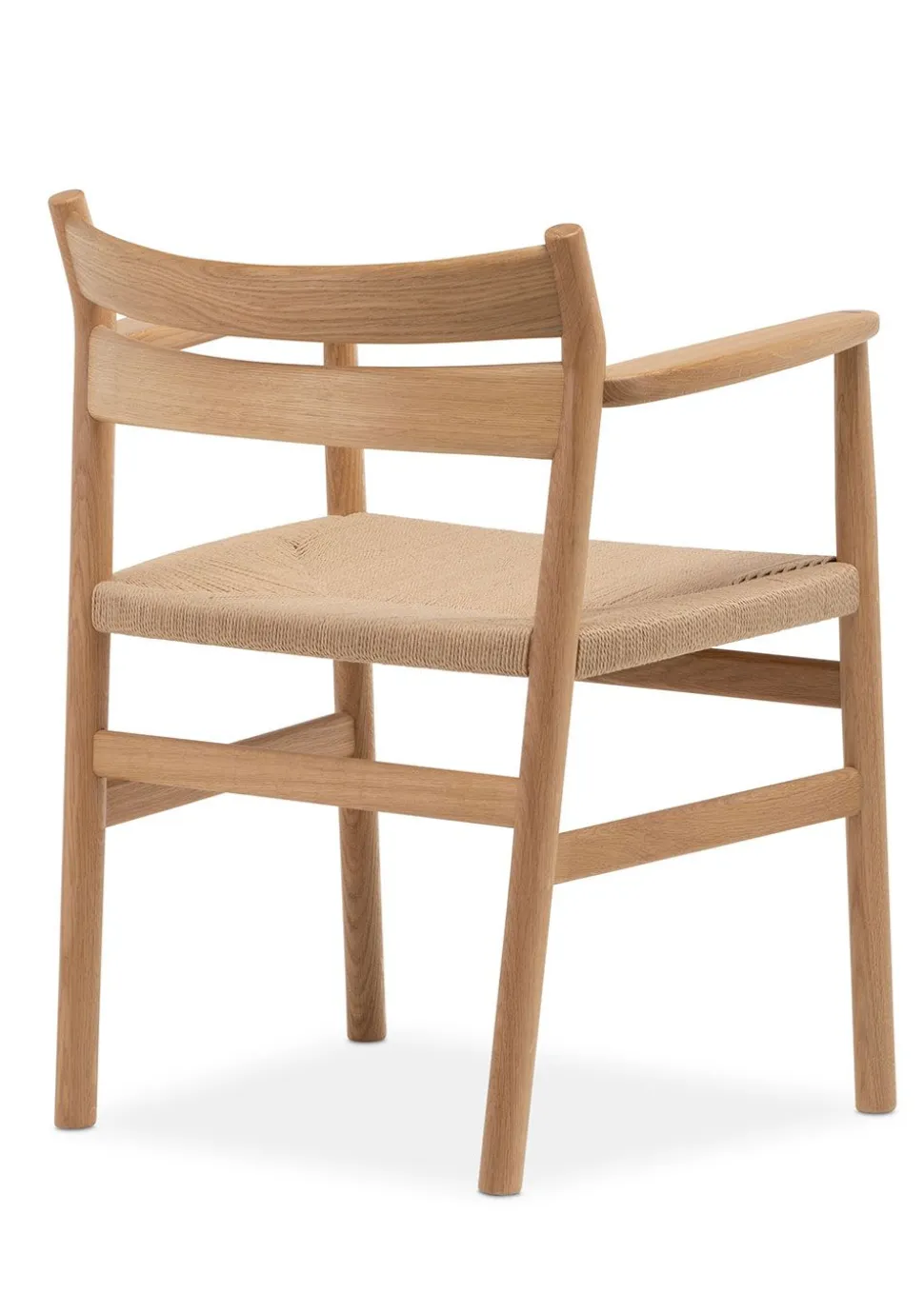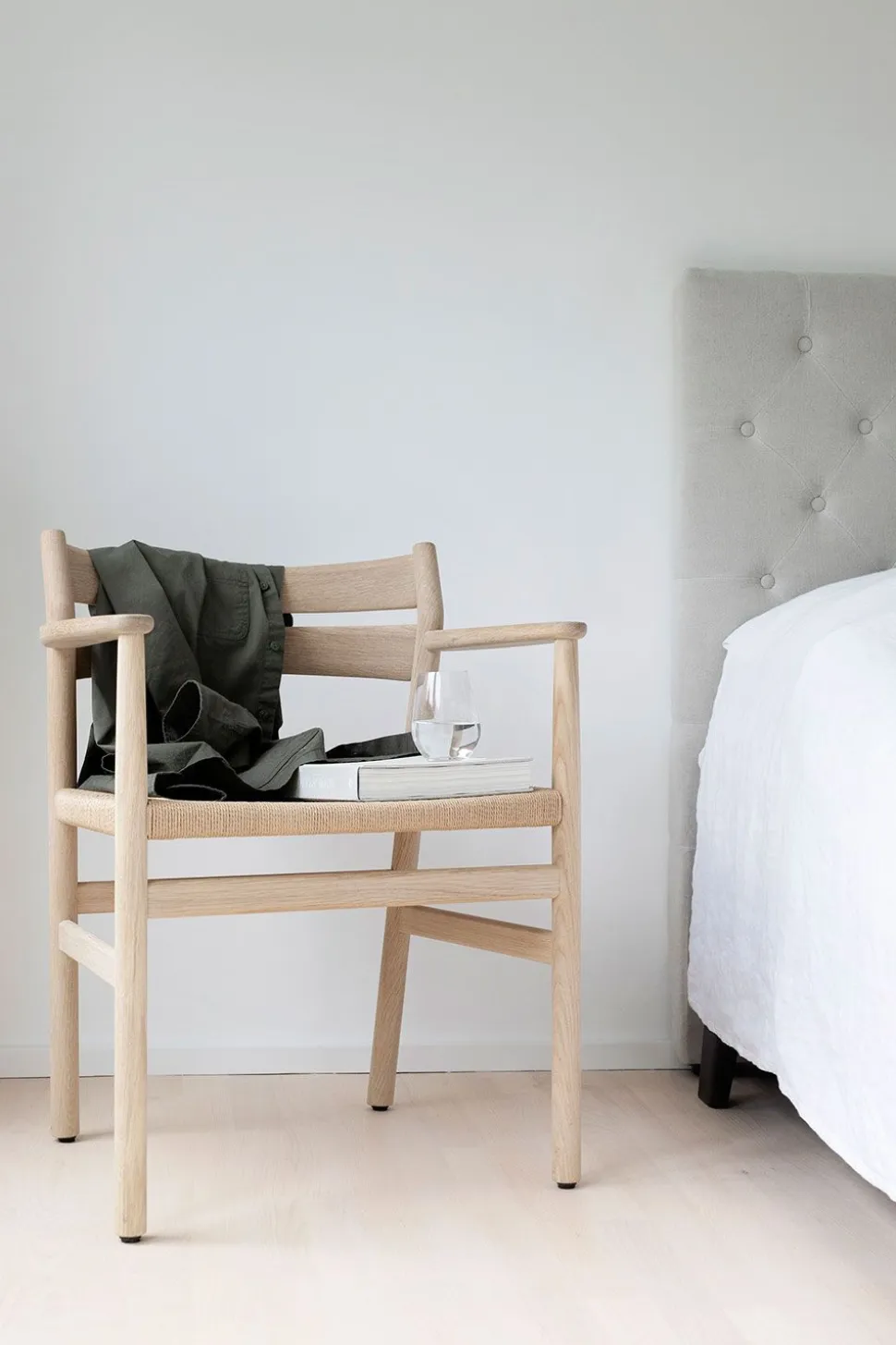 - Material: Massivholz in seifenbehandelter Eiche, geölter Eiche, schwarz lackierter Eiche oder geölter Räuchereiche mit schwarzem Furnier an der Armlehnenverbindung. Sitz aus naturfarbener oder schwarzer Papierkordel. Die Kordel ist mit Seife und Wachs behandelt, wodurch sie schmutzabweisend wird.