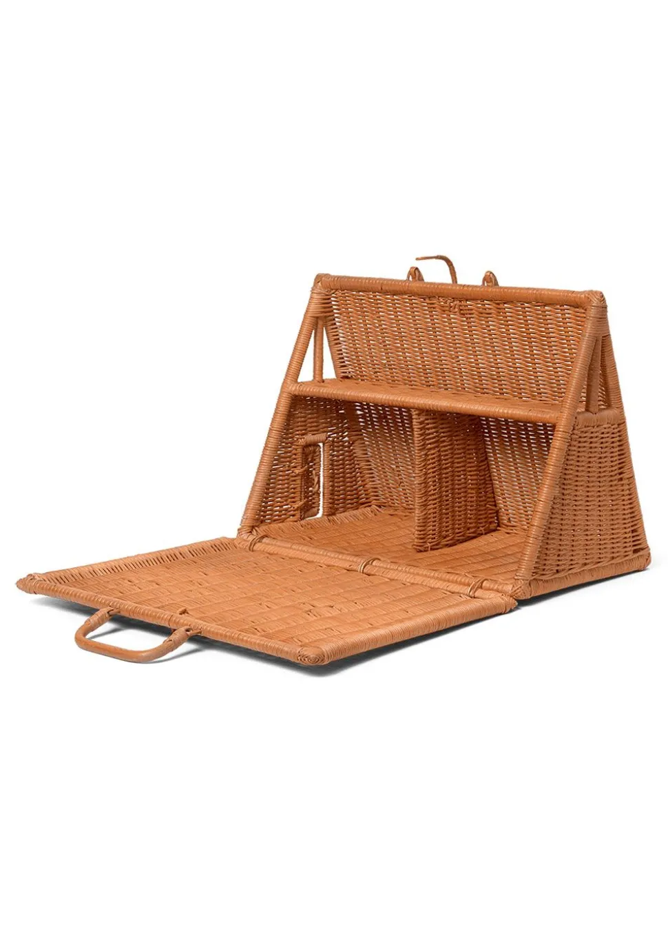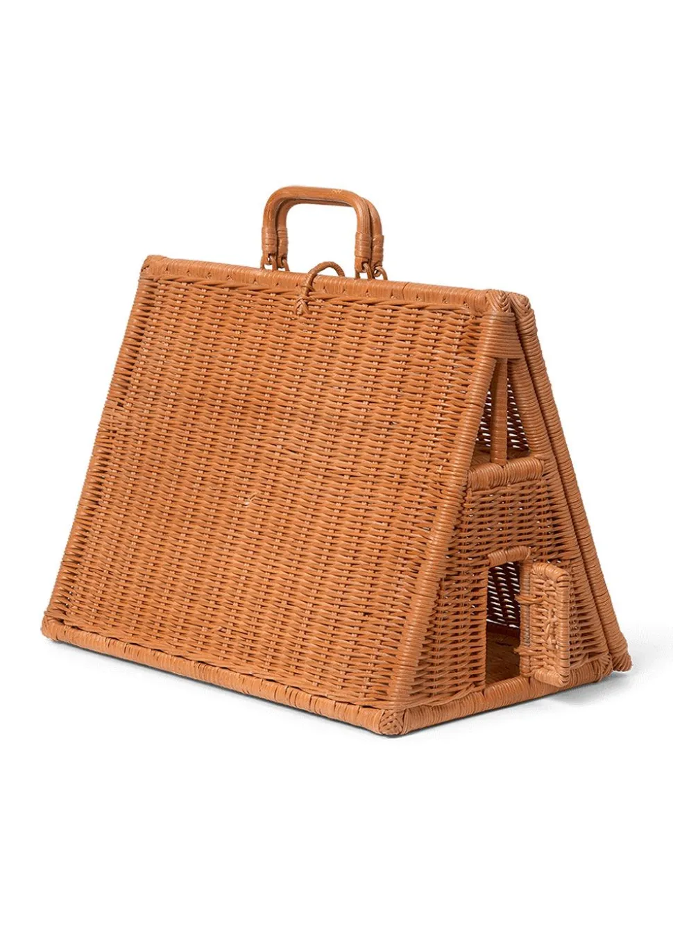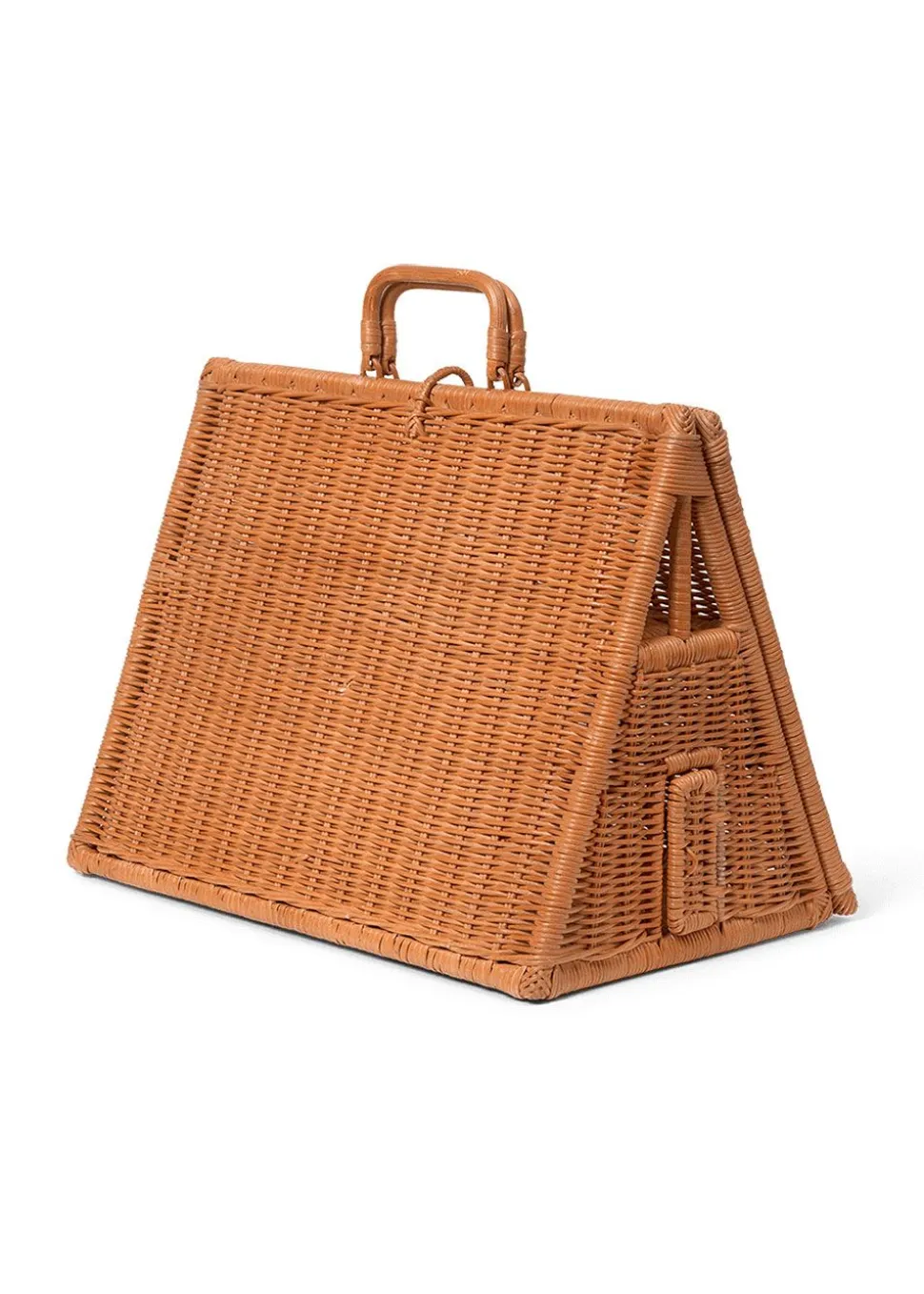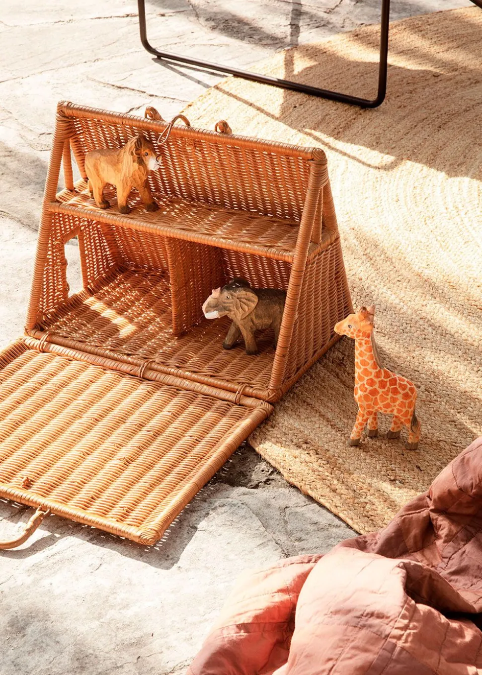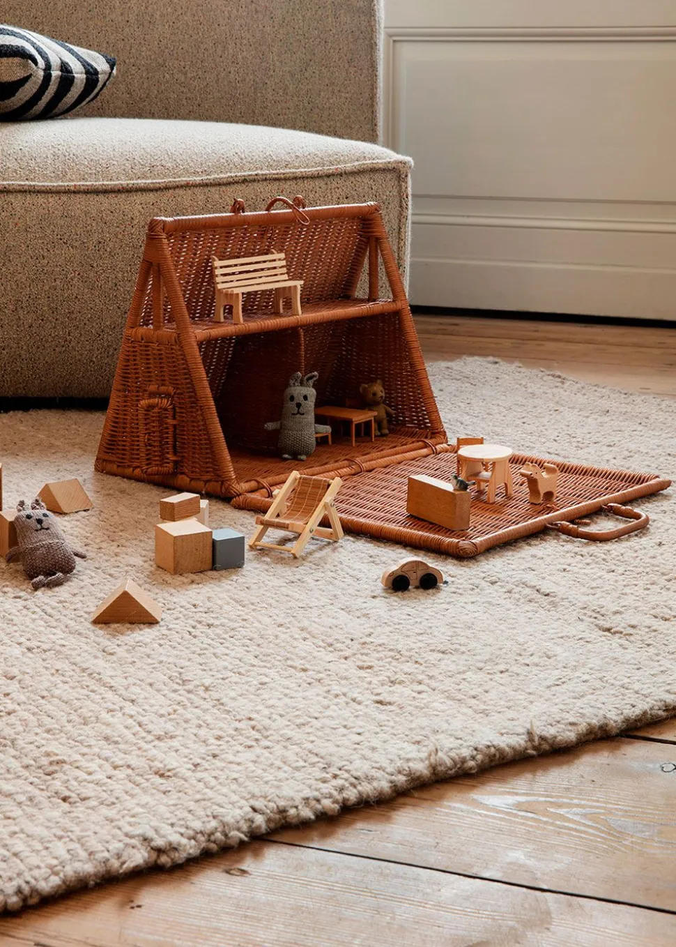 Das schöne und aufregende A-House von funktioniert wie ein kleines Puppenhaus mit einer Tür, die ins Haus führt. Das Haus ist vom Archetyp A-Haus inspiriert, mit kleinen Zimmern, die Sie einrichten können. Das Haus ist aus geflochtenem Rattan gefertigt und dient sowohl als Puppenhaus als auch als tragbare Tasche. Die Tasche hilft Ihrem Kind, sein Spielzeug von einem abenteuerlichen Universum zum nächsten zu transportieren.