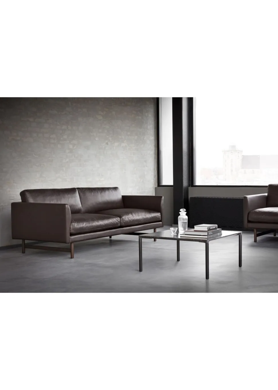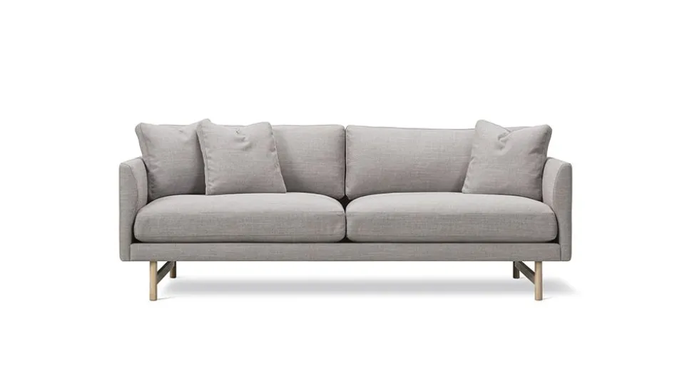 Eine massive Schale formt die Arm- und Rückenlehnen und bildet den Rahmen für den Rest des Möbels. Die Nähte der Polsterung schlängeln sich unsichtbar durch die Möbel und bilden ein subtiles, charakteristisches Detail für die gesamte Calmo“-Serie. Breite Kissen sorgen für den Komfort und das prächtige Lounge-Gefühl, das viele moderne nordische Möbel auszeichnet.