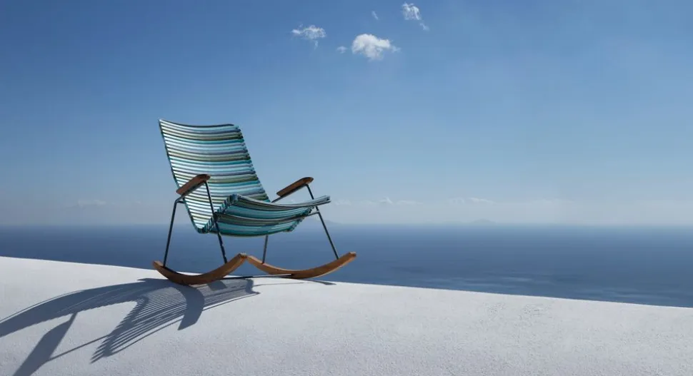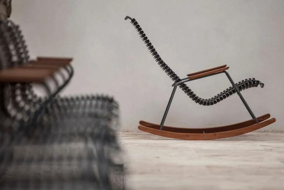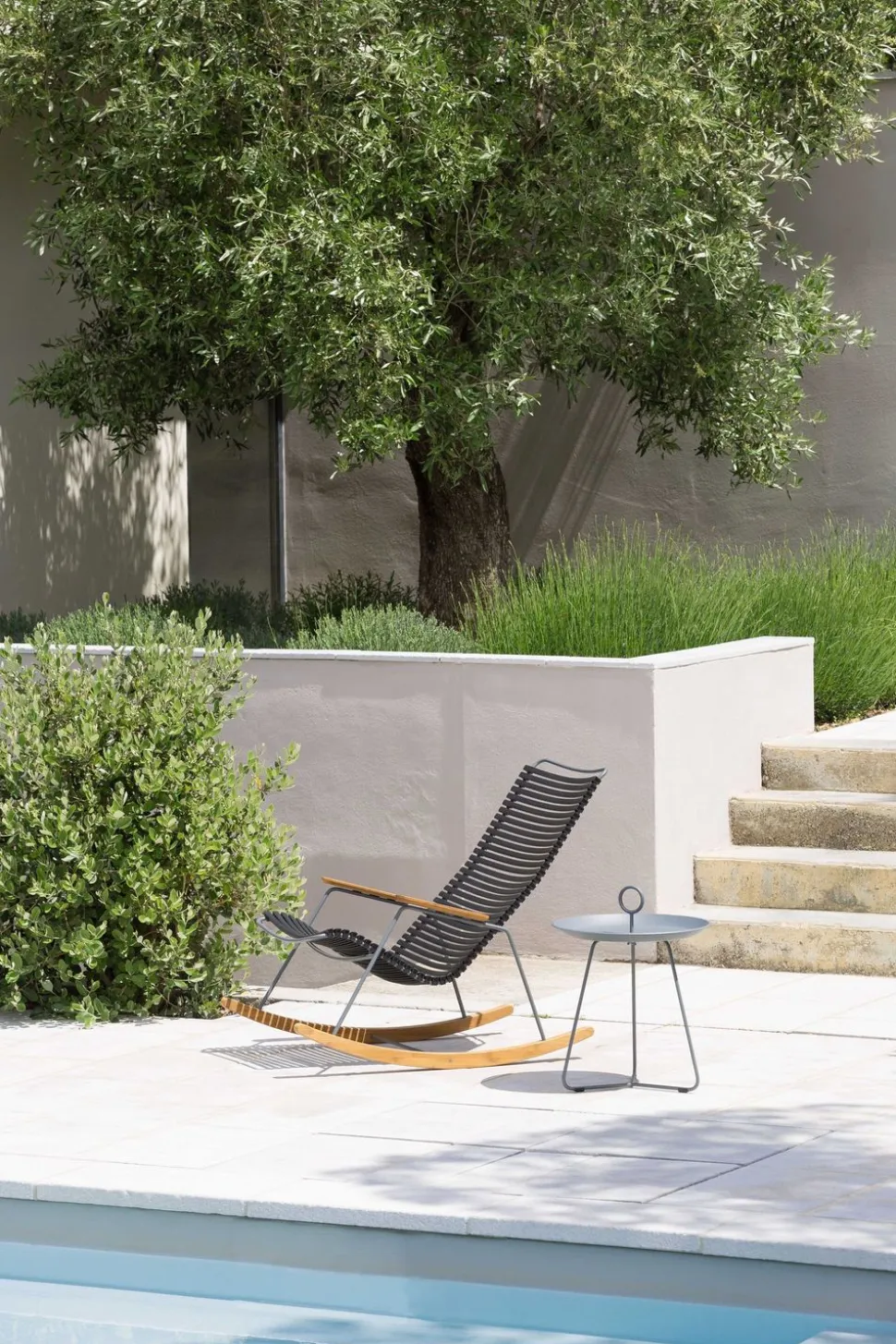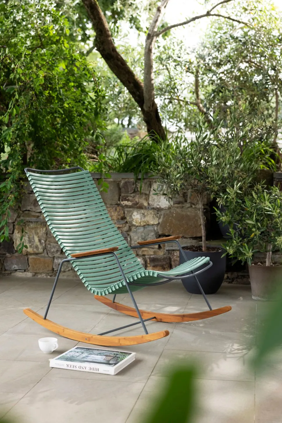 Der Click Rocking Chair von , entworfen von Henrik Pedersen, verbindet skandinavische Eleganz mit einer spielerischen und entspannenden Funktion. Die Kunststofflamellen des Stuhls passen sich den Konturen des Körpers an, während der pulverbeschichtete Stahlrahmen für eine stabile Konstruktion sorgt. Die Bambusverzierungen an den Armlehnen und den Seiten bilden einen warmen, organischen Kontrast, der die zeitlose Ästhetik des Sessels unterstreicht. Die sanfte Schaukelbewegung vermittelt ein Gefühl der Ruhe und ist sowohl für den Innen- als auch für den Außenbereich geeignet.