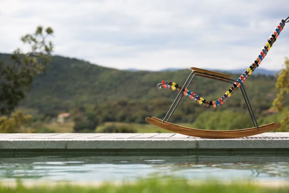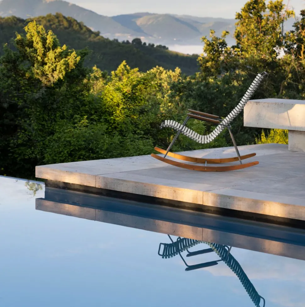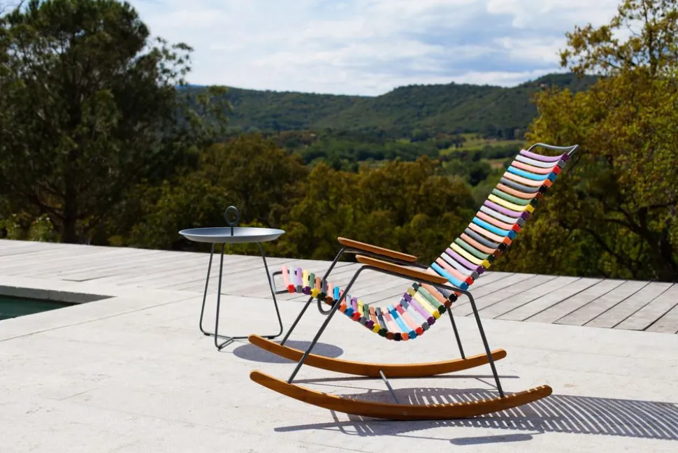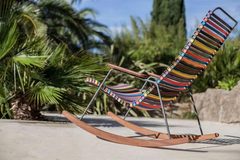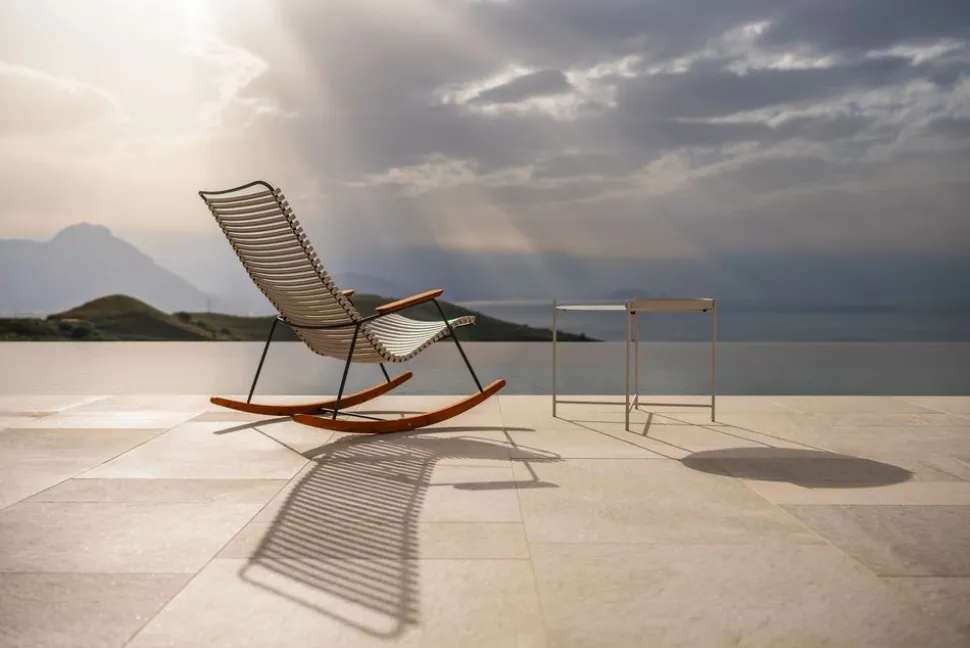 Der Click Rocking Chair von , entworfen von Henrik Pedersen, verbindet skandinavische Eleganz mit einer spielerischen und entspannenden Funktion. Die Kunststofflamellen des Stuhls passen sich den Konturen des Körpers an, während der pulverbeschichtete Stahlrahmen für eine stabile Konstruktion sorgt. Die Bambusverzierungen an den Armlehnen und den Seiten bilden einen warmen, organischen Kontrast, der die zeitlose Ästhetik des Sessels unterstreicht. Die sanfte Schaukelbewegung vermittelt ein Gefühl der Ruhe und ist sowohl für den Innen- als auch für den Außenbereich geeignet.