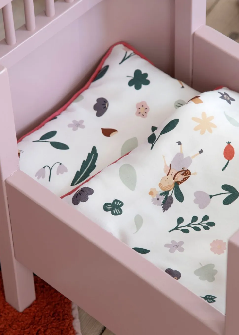 Niedliches Puppenbett und Kissen mit Druck aus dem Pixie Land von . Die Puppenbettwäsche passt auf das Puppenbett, den Puppenkorb und den Puppenwagen, so dass Ihr Kind selbst entscheiden kann, wo es die Puppen oder Teddybären unterbringen möchte. Die Puppenbettwäsche ist aus dem gleichen Stoff wie die Baby- und Juniorbettwäsche von gefertigt. Die Bettwäsche wird durch die Webmethode Satinweben hergestellt, die ein exklusives und glänzendes Gefühl erzeugt, da das Ergebnis glänzender, dichter und weicher ist. Als kleines nettes Detail hat die Bettwäsche einen Randstreifen.