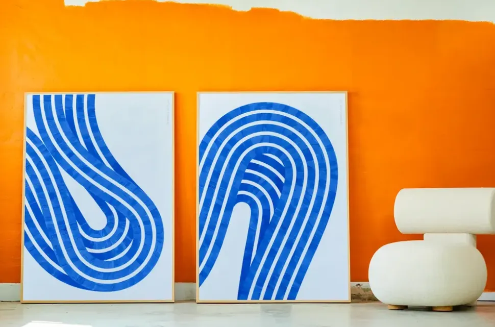 Diese vier von Jelena Donkos entworfenen Bilder sind alle Teil der fortlaufenden Erkundung der Wellenlänge der Farbe, die in diesem Fall ein schönes Blau und ein neutraler Sand ist. Diese vier Bilder würden sich in Ihrer Wohnung gut machen. Sie können Farben miteinander kombinieren, sich aber auch auf eine der Farben beschränken, um einen einzigartigen Raum zu schaffen. Mit Acrylfarbe auf schwerem, strukturiertem Aquarellpapier ausgedrückt, wird die Textur durch bewusste Anpassungen der Fließfähigkeit und Transparenz in der Beziehung zwischen diesen beiden Gemälden geschaffen.