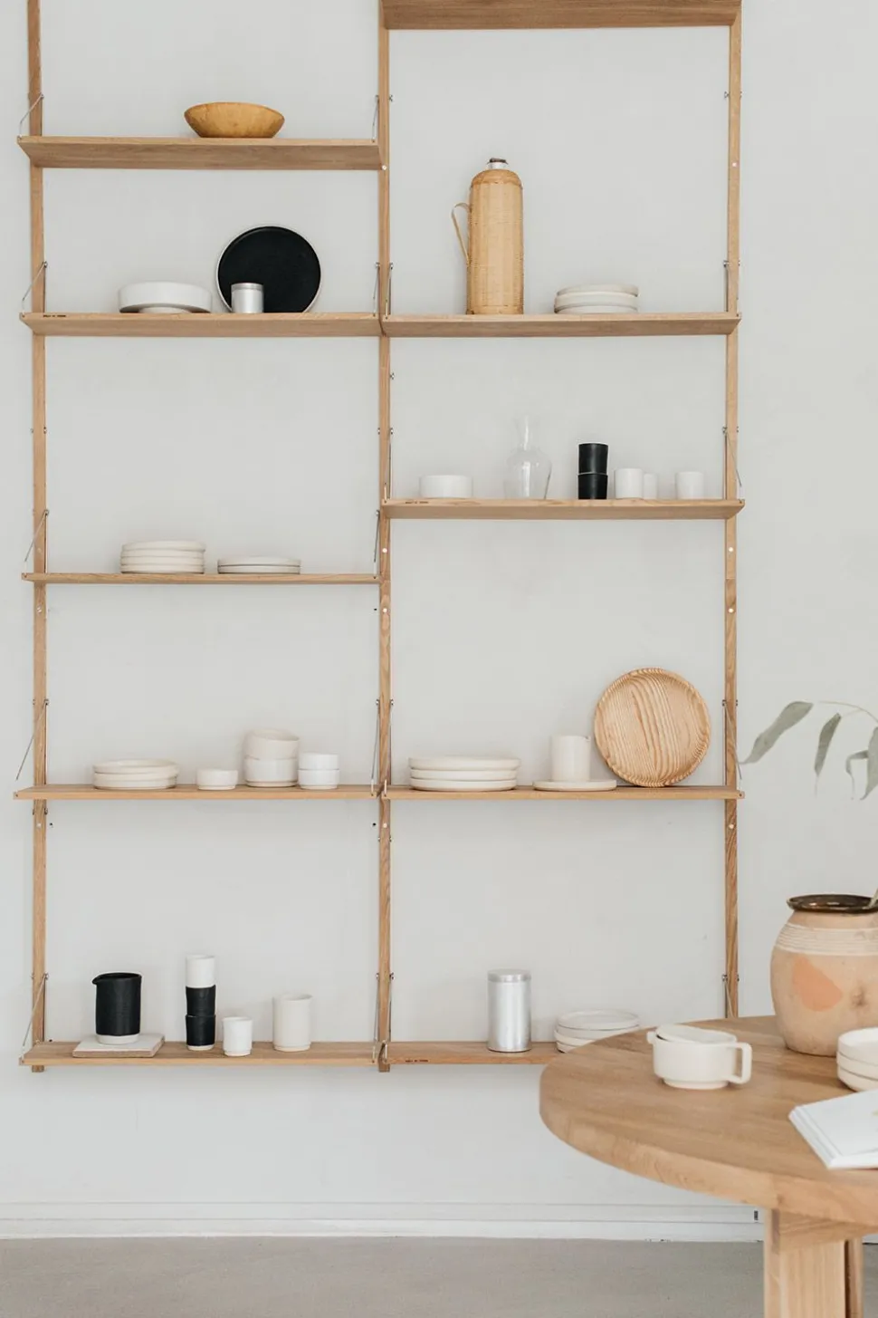 Esstisch auf dem Bauernhof, der ländliche Ästhetik ausstrahlt, kombiniert mit modernen nordischen Trends. Die rustikale Eiche mit Ästen verleiht der ansonsten schlichten Silhouette, die sich aus einer doppelseitigen Tischplatte, einer polierten und einer unpolierten Oberfläche sowie einem Gestell in traditioneller Bockbauweise, das die Tischplatte trägt, zusammensetzt, Charakter.