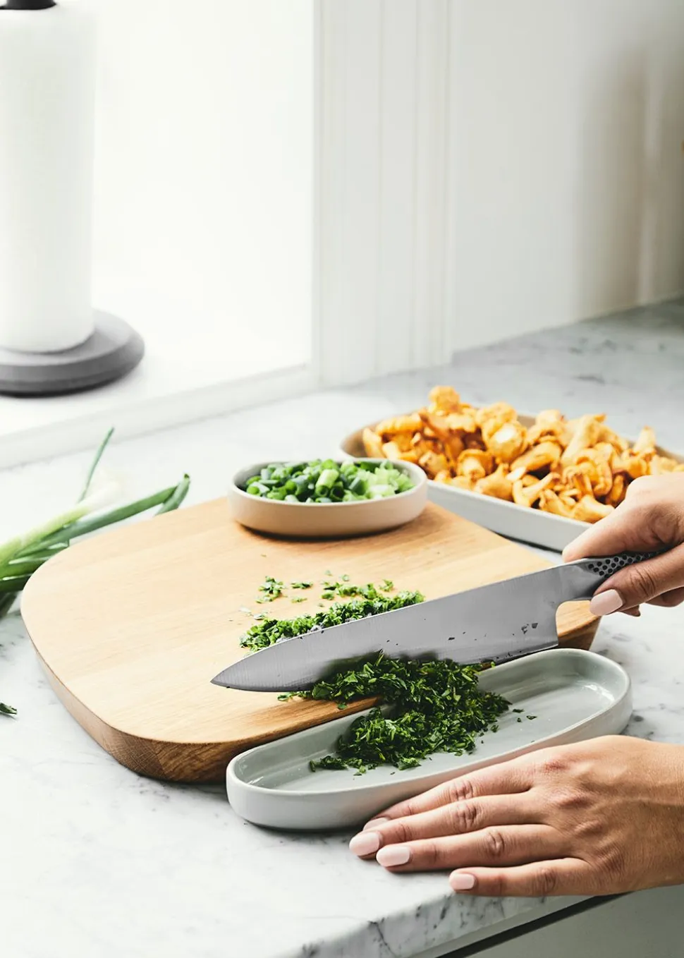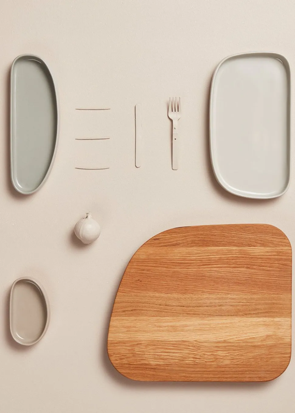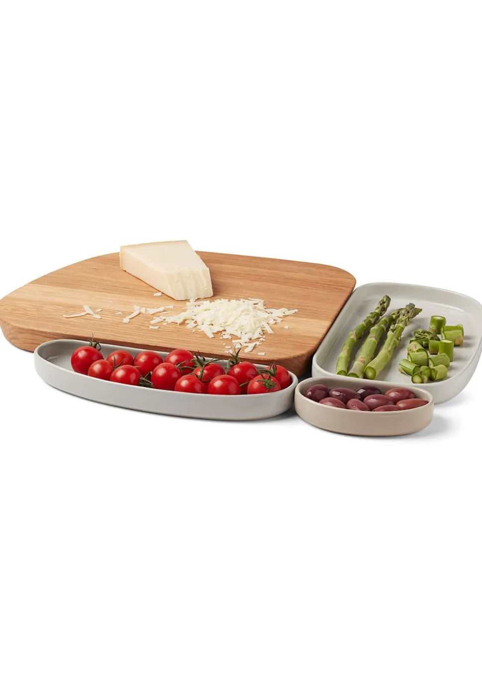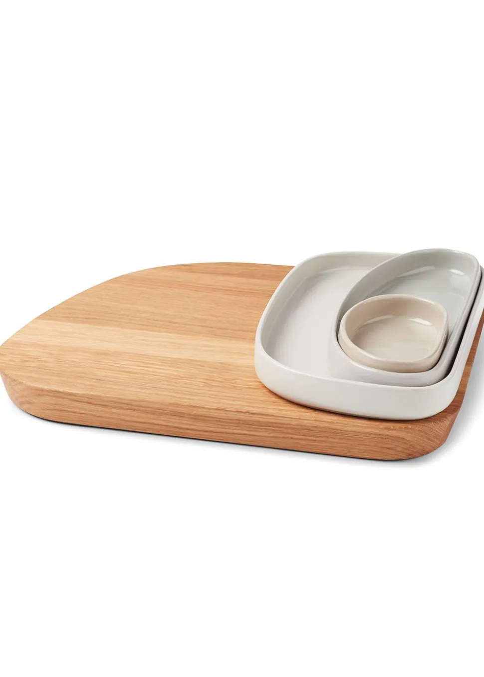 GALET besteht aus und besteht aus einem Schneidebrett und drei Keramikschalen in verschiedenen Größen. Das Schneidebrett ist aus Eiche gefertigt, was ihm ein sofortiges Qualitätsgefühl verleiht. Die Keramikschalen sind außen matt und innen glasiert, was Kratzer verhindert. Sie passen ineinander und werden auch an die Kante des Schneidebretts angepasst. So lässt sich das frisch geschnittene Gemüse leicht in die Schalen schieben. Die Schalen können in den Ofen, die Geschirrspülmaschine und die Mikrowelle gestellt werden.
