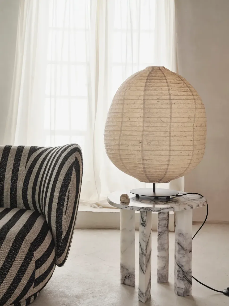 Material: Washi-Papier mit Edelstahldraht und Gestell aus rostfreiem Stahl. Pulverbeschichteter Eisensockel mit E27-Fassung 2,6 Meter schwarzes Textilkabel mit An-/Ausschalter.