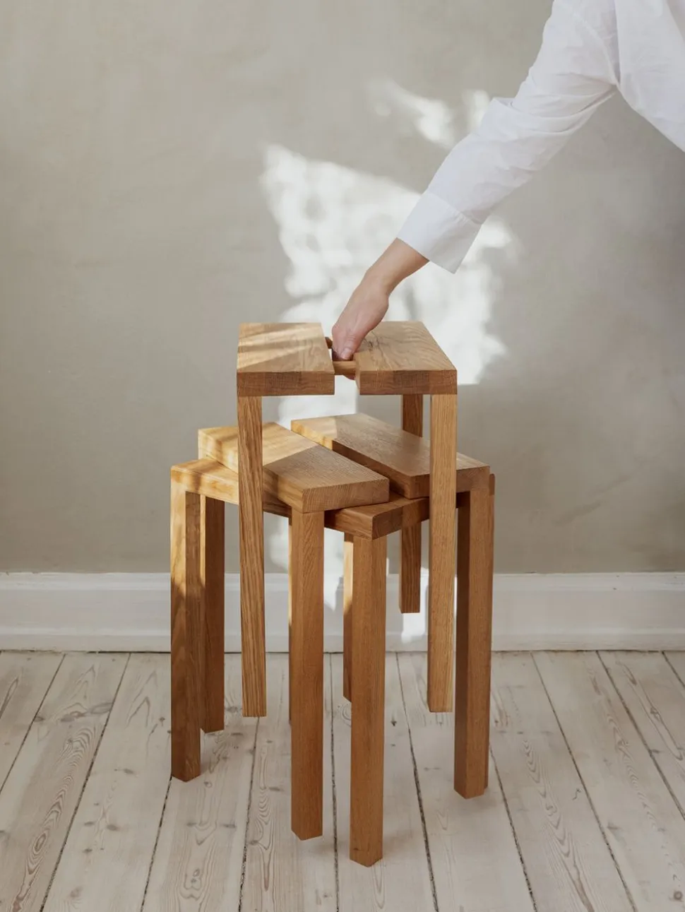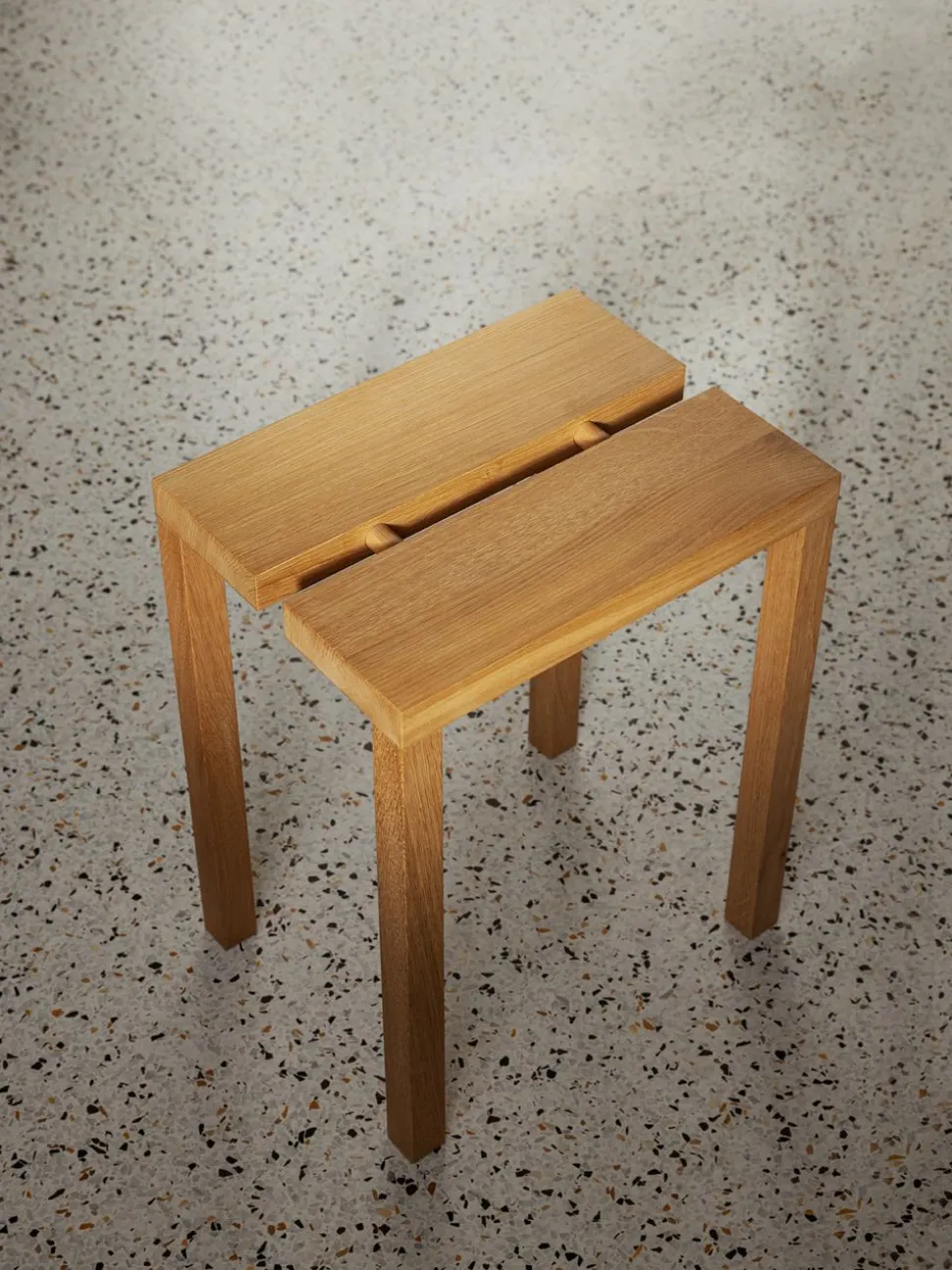 Der Peg Hocker wird von Moebe hergestellt. Der Hocker wird aus FSC-zertifizierter Eiche in Europa hergestellt. Der Peg Stool besteht aus zwei Eichenholzstücken, die in der Mitte mit zwei Pflöcken verbunden sind. Der Stuhl eignet sich gut als Sitzgelegenheit, Ausstellungsständer oder kleiner Tisch.