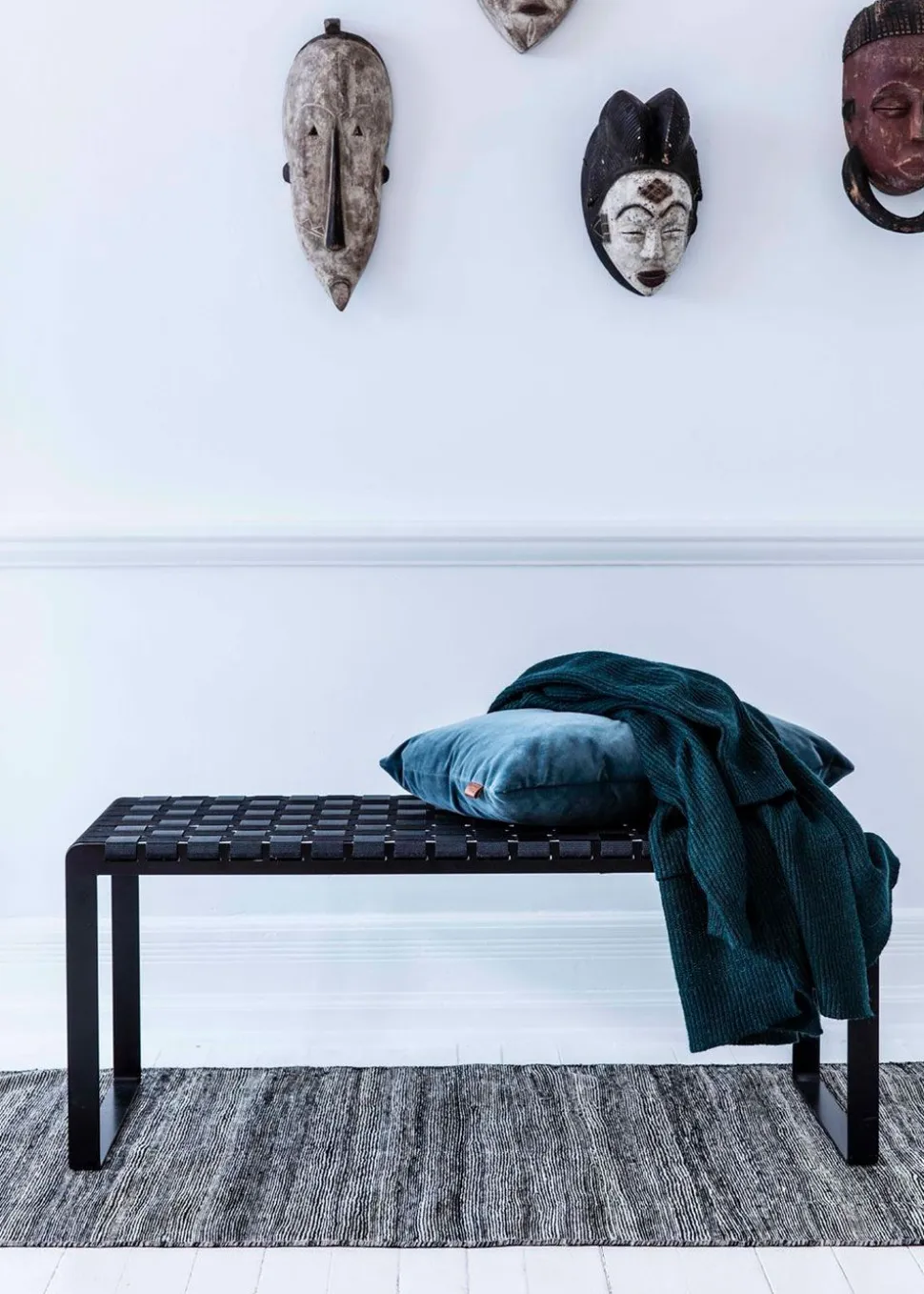 Geflochten wird von hergestellt. Die Bank ist perfekt für die Eingangshalle, wo sie zum Sitzen verwendet werden kann, wenn Sie Ihre Schuhe binden. Der Sitz ist entweder aus schwarzem Nylon oder Narbenleder in Schwarz oder Natur, und der Rahmen ist aus schwarz pulverbeschichtetem Stahl gefertigt.