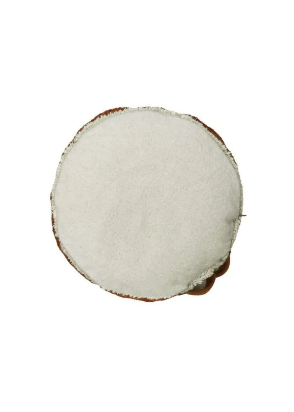 Der Boletus-Pouf kombiniert einen unteren Teil aus weich getuftetem, naturfarbenem Baumwollflor mit einem toffeefarbenen oberen Teil mit kleinen geknüpften, naturfarbenen Punkten. An der Seite sind zwei kleine Pilze aus geflochtenen Baumwollschnüren handgefertigt. Der Bezug ist mit einem Reißverschluss abnehmbar und kann leicht gewaschen werden. Die innere Füllung besteht aus leichten Polystyrolkügelchen.