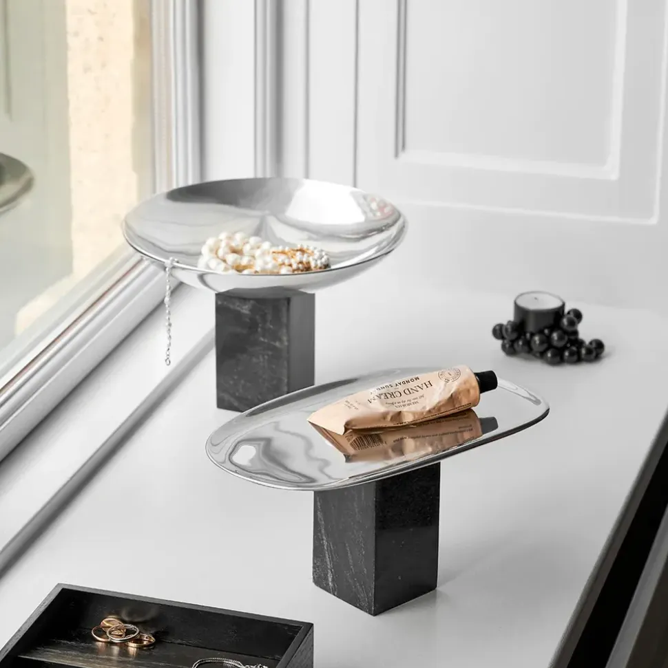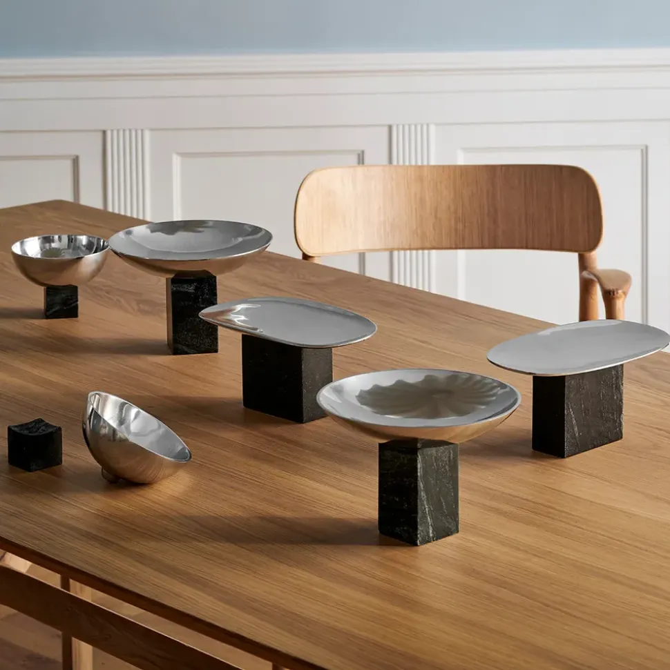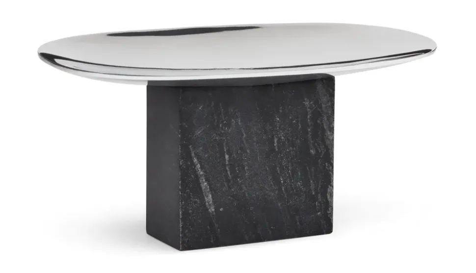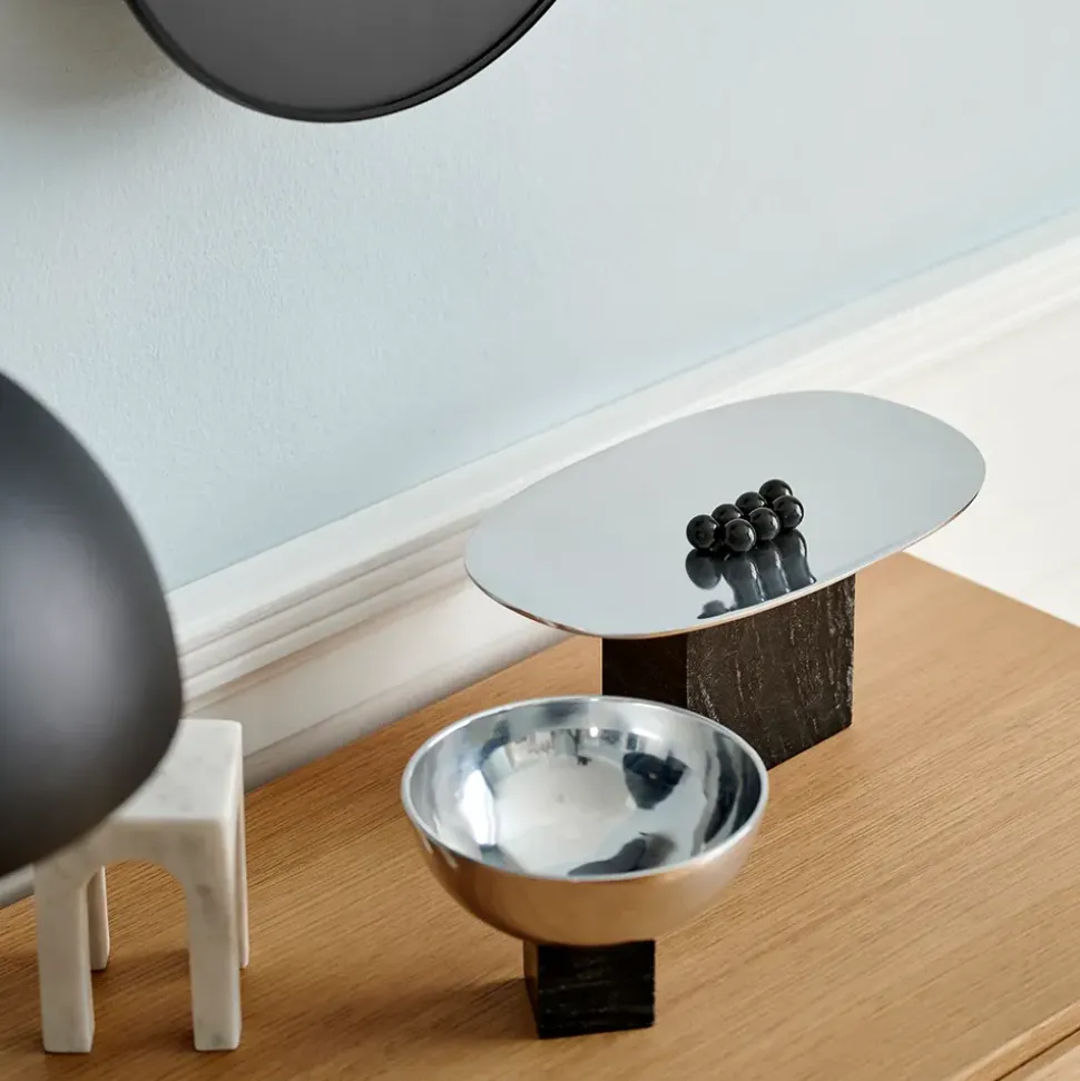 Sapoto sind elegante Schalen von . Die Schalen sind in zwei verschiedenen Größen erhältlich, einem kleinen und einem mittelgroßen Modell. Die Sapoto-Schalen sind in Schwarz und Silber gehalten, was für ein elegantes Finish sorgt. Das Wort Sapoto ist japanisch und bedeutet „mit Unterstützung“. Das weiche Sandgussaluminium ist elegant poliert und mit einem einzigartigen Marmorstein kombiniert, der dem Raum sofort ein stilvolles Aussehen verleiht. Die Schalen eignen sich perfekt als elegantes Kunstwerk für das Wohnzimmer. Sie lassen sich auch leicht in der Küche als einzigartige Obstteller aufstellen.