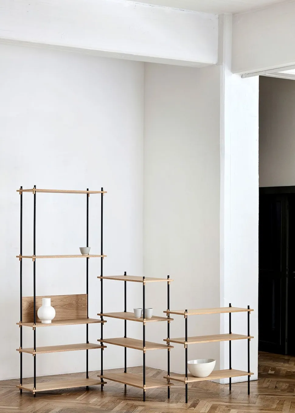 Das intelligente und einfache Regalsystem wird von Moebe hergestellt. Das Regalsystem besteht aus Eiche in vielen verschiedenen Varianten und ist mit Keilen aufgebaut. Die Keile bieten die Möglichkeit, die Regale und Systeme entsprechend den spezifischen Bedürfnissen zu platzieren. Die Möbel können z.B. so hoch oder so breit wie gewünscht. Es ist auch möglich, um Ecken herum zu bauen. Das System kann auch als Raumteiler dienen, wenn es an eine Wand gestellt oder mit anderen Regalsystemen der Serie „Regalsystem“ kombiniert wird.