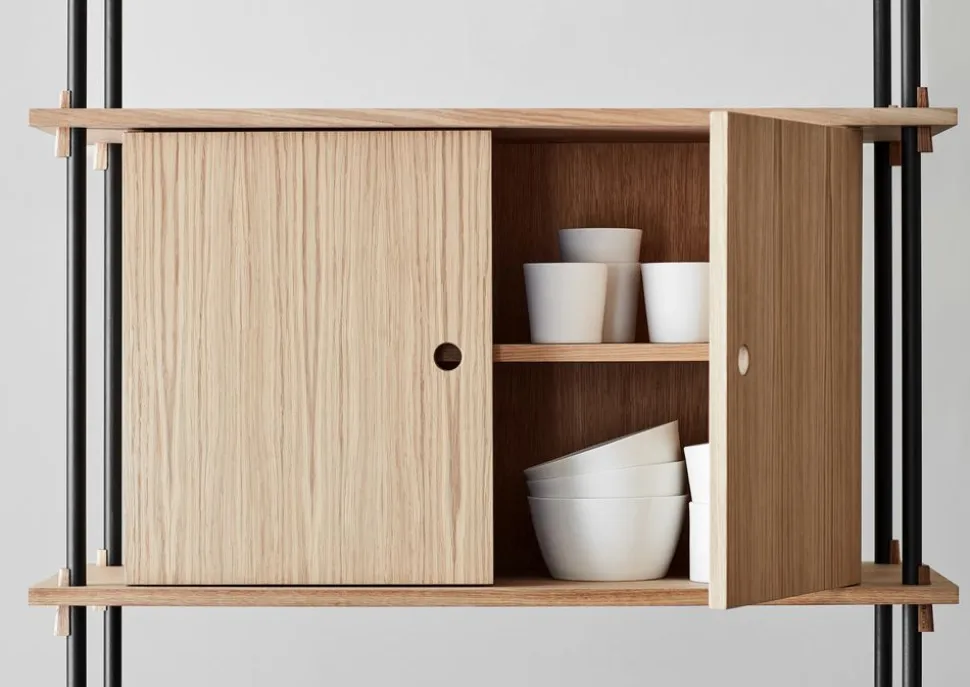 Das intelligente und einfache Regalsystem wird von Moebe hergestellt. Das Regalsystem ist aus Eiche in vielen verschiedenen Varianten gefertigt und wird mit Keilen aufgebaut. Die Keile bieten die Möglichkeit, die Regale und Systeme entsprechend den spezifischen Bedürfnissen zu platzieren. Mit den Möbeln ist es möglich, um Ecken zu bauen sowie hoch oder breit zu bauen. Das System kann auch als Raumteiler, an der Wand oder in Kombination mit anderen Regalsystemen der Serie „Regalsystem“ verwendet werden.