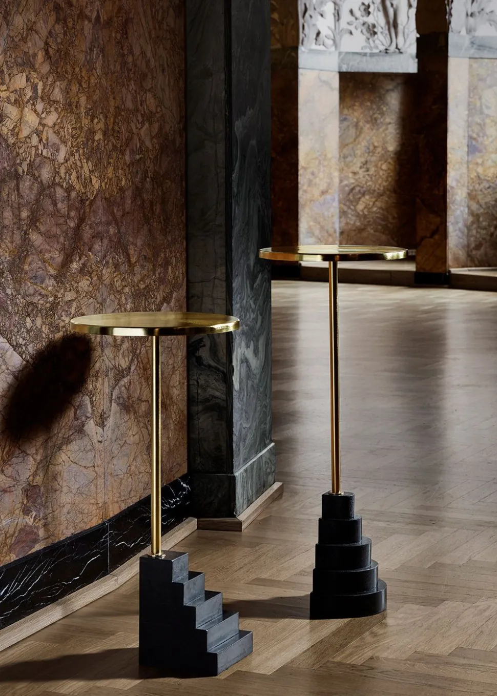 SOLUM Beistelltische aus dem dänischen sind einzigartige und attraktive Möbel mit einem Sockel aus schwarzem Granit und Marmor und einem eleganten Tisch aus messingbeschichtetem und pulverbeschichtetem Metall. Die Tische sind in drei verschiedenen Größen erhältlich: klein, die als Nachttisch verwendet werden können, mittel und groß, die als kleiner Couchtisch, Stehtisch oder Pflanzenständer verwendet werden können. Egal, wie Sie sich für SOLUM entscheiden, sie werden die Aufmerksamkeit auf sich ziehen und dem Raum einen Charakter verleihen.