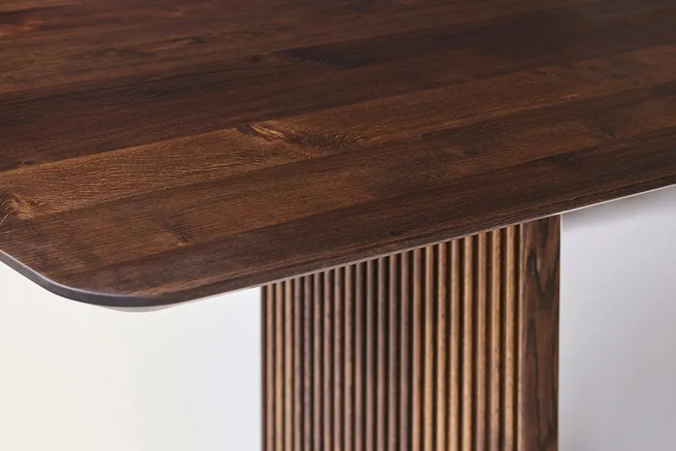 Die Tischplatte und die Beine des Esstisches sind aus Massivholz gefertigt, was dem Design ein schönes Zusammenspiel mit den Gestaltungsdetails verleiht. Zu den feinen Designdetails gehören die abgeschrägte Kante der Tischplatte und die schönen vertikalen Rillen auf dem Würfel.