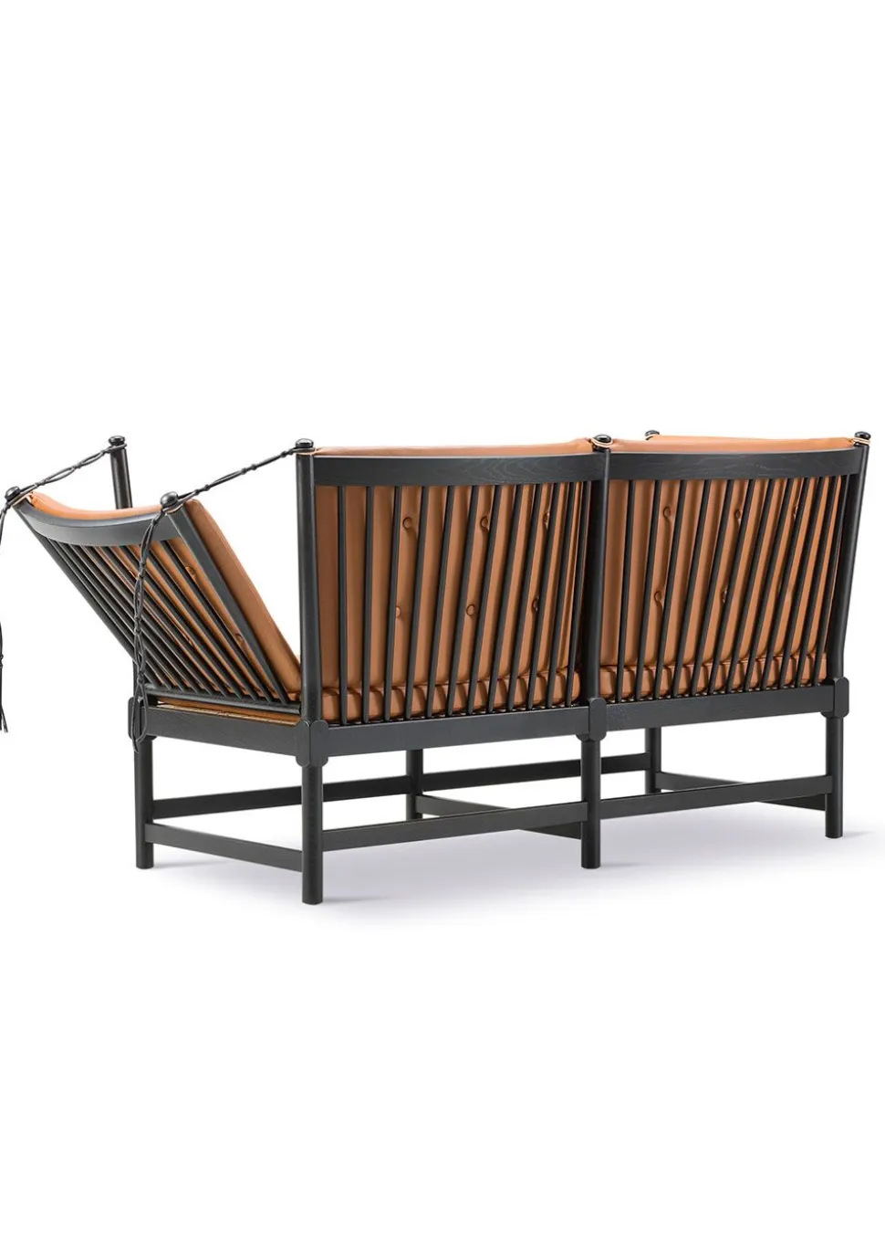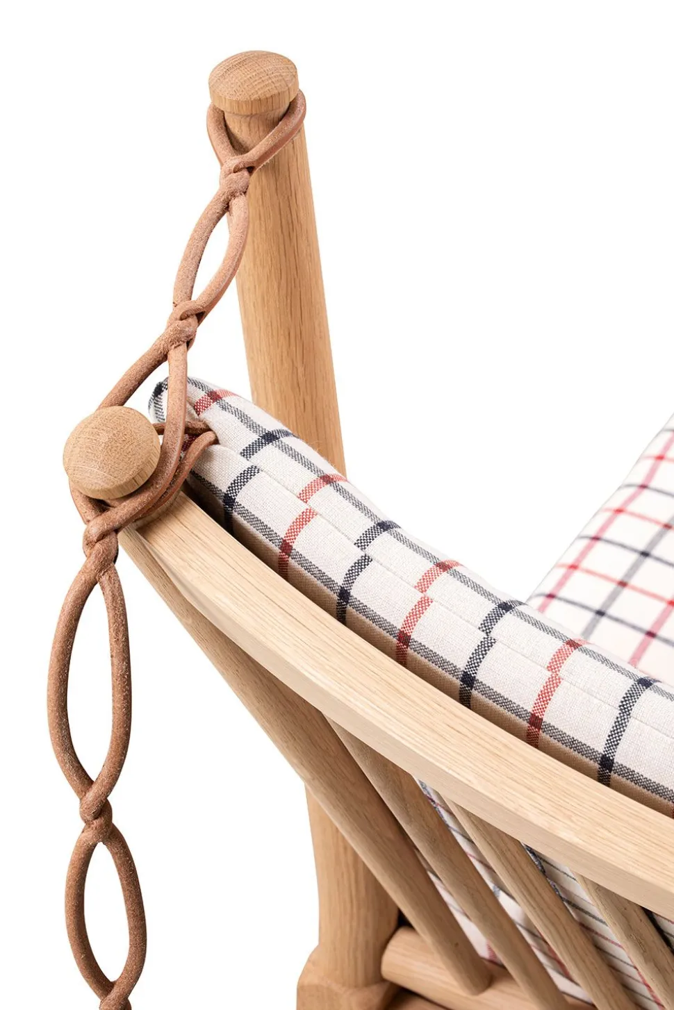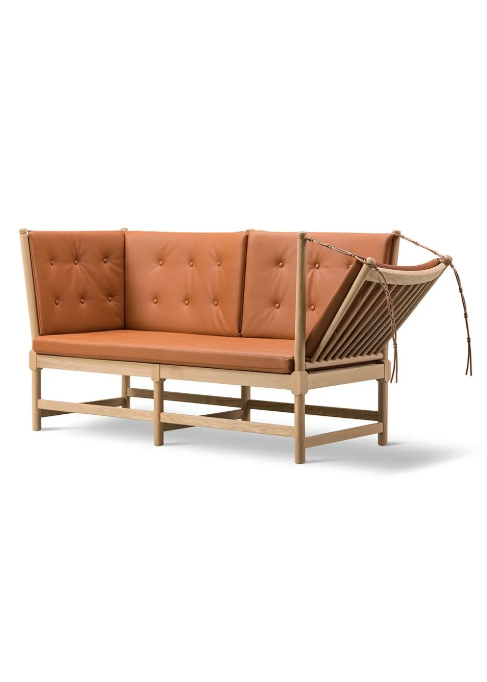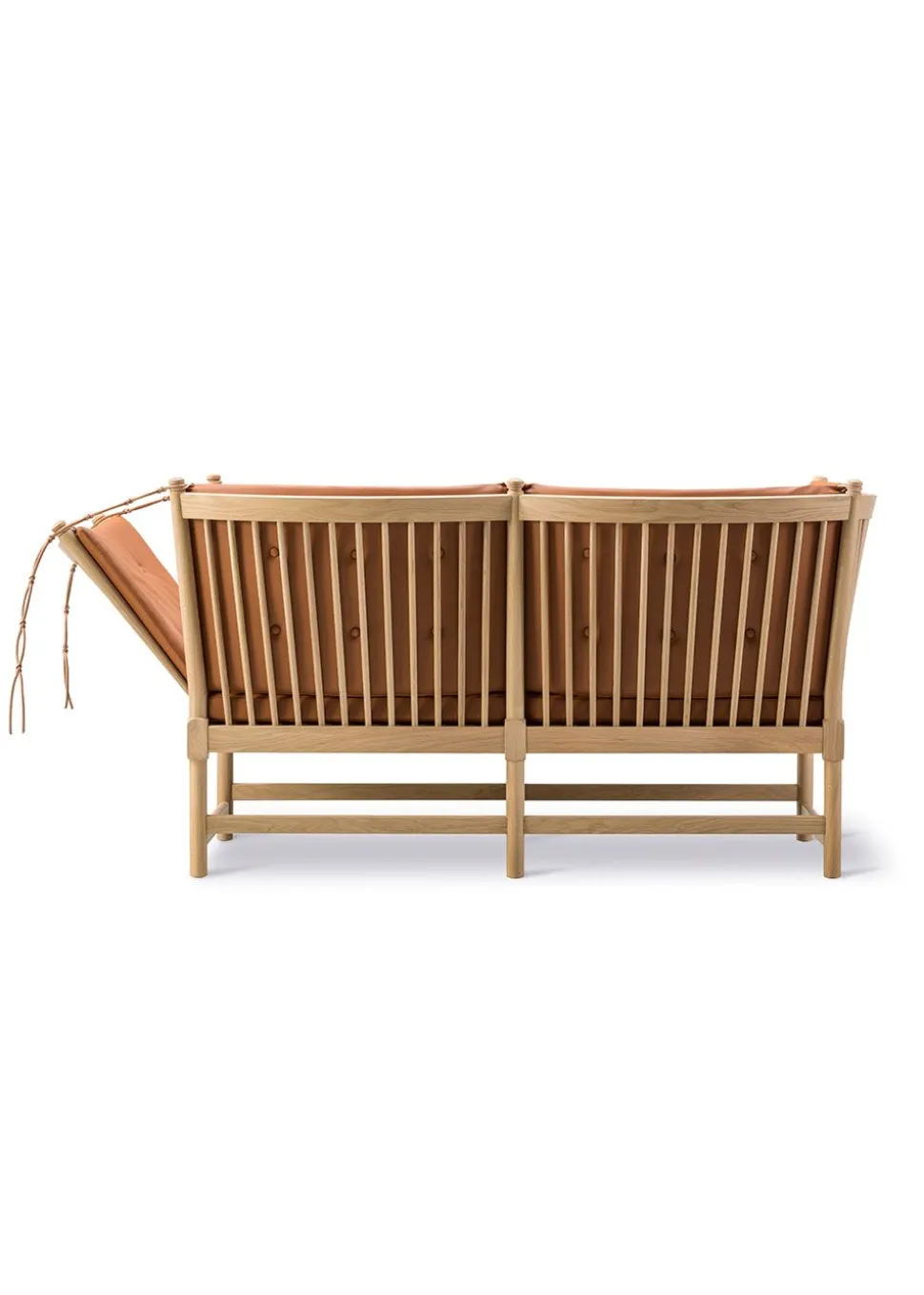 Das ikonische Möbelstück hat seinen Status aufgrund seines bahnbrechenden Designs erlangt, das auf elegante Weise die Ideen des englischen Daybeds und der französischen Chaiselongue vereint. Børge Mogensen hat den Komfort dieses Möbels in einer flexiblen Armlehne nachgebildet, die über charakteristische Lederriemen, die auf die Farbe des jeweiligen Möbelstücks abgestimmt sind, im Winkel verstellt werden kann. Dies eröffnete eine völlig neue Dimension des flexiblen Komforts, der zu einem der wichtigsten Werte des beliebten Designers geworden ist. Die Funktionalität der Möbel wurde mit einem traditionellen dänischen Design kombiniert, das, charakteristisch für Mogensens Design, das Holz als tragendes Material der Möbel einbezieht. Der optische Holzrahmen bildet den Rahmen für die eleganten Kissen, die durch Knöpfe ergänzt werden, die dem Kissen zusätzliches Volumen verleihen. Das Sofa ist in der ikonischen Textilie Cotil erhältlich, die mit ihren charakteristischen Karos und traditionellen Farben dazu beiträgt, den ursprünglichen Geist des Möbels zu erhalten, und die perfekt zum behandelten Holz passt.
