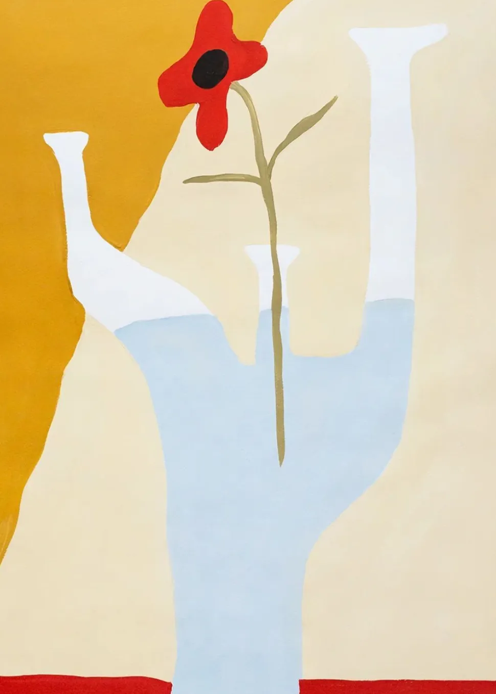 Three parts wurde von der Künstlerin Marta Chmielecka entworfen. Das Plakat ist farbenfroh und hat eine einzige Illustration. Sein Motiv zeigt eine ästhetische blaue Vase und eine schöne Blume. Im Hintergrund sieht man eine currygelbe und beige Farbe, die einen einzigartigen, kontrastreichen Look erzeugt.