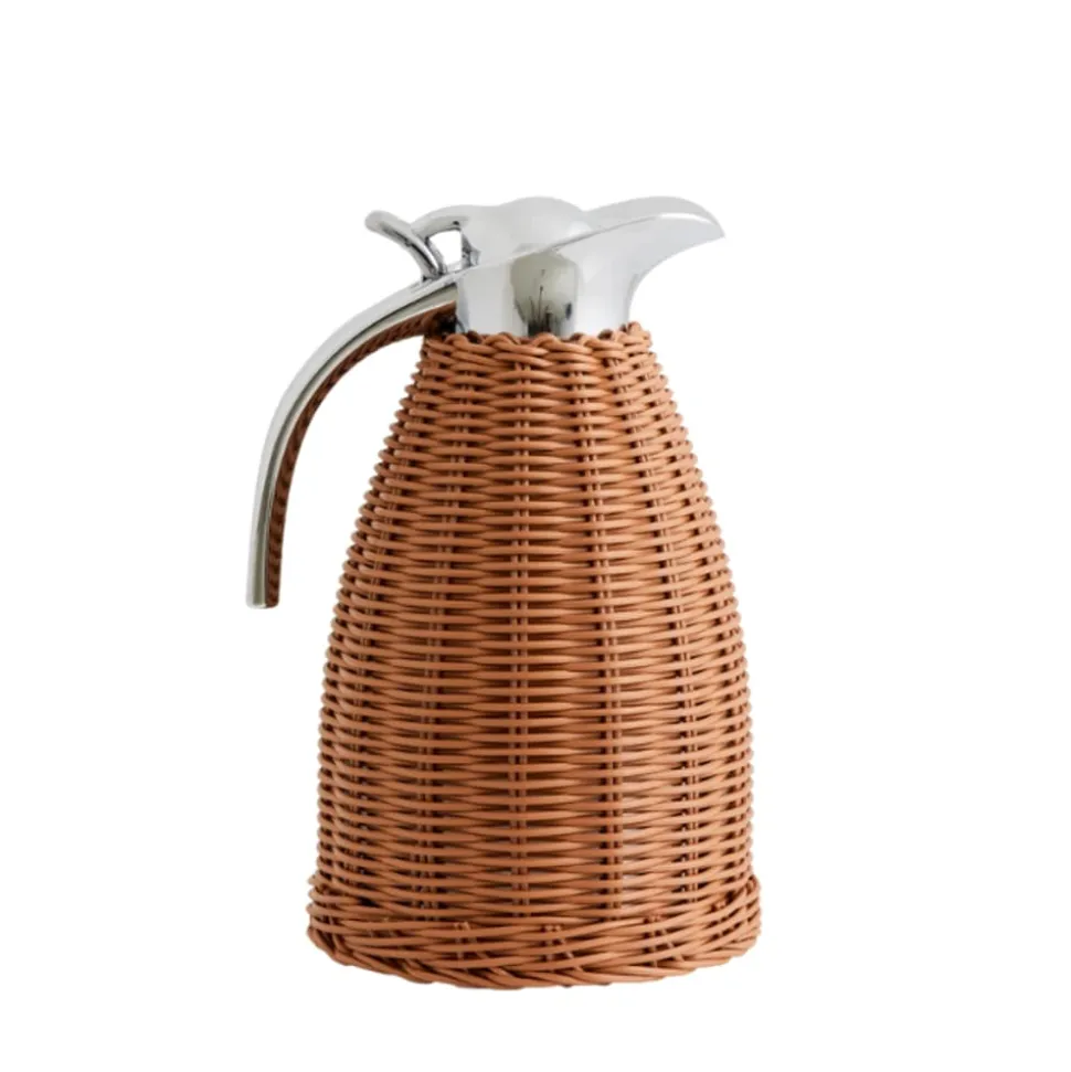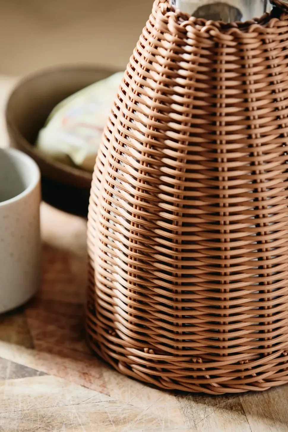 Die Tincan Thermokanne von kombiniert glänzendes Chrom mit handgeflochtenem Rattan und schafft so einen schönen Kontrast zwischen Moderne und Natur. Die elegante Silhouette und die edle Oberfläche machen sie zu einer stilvollen Ergänzung für jeden Tisch, während das geräumige Fassungsvermögen von 1400 ml dafür sorgt, dass Ihre heißen Getränke stundenlang warm bleiben.