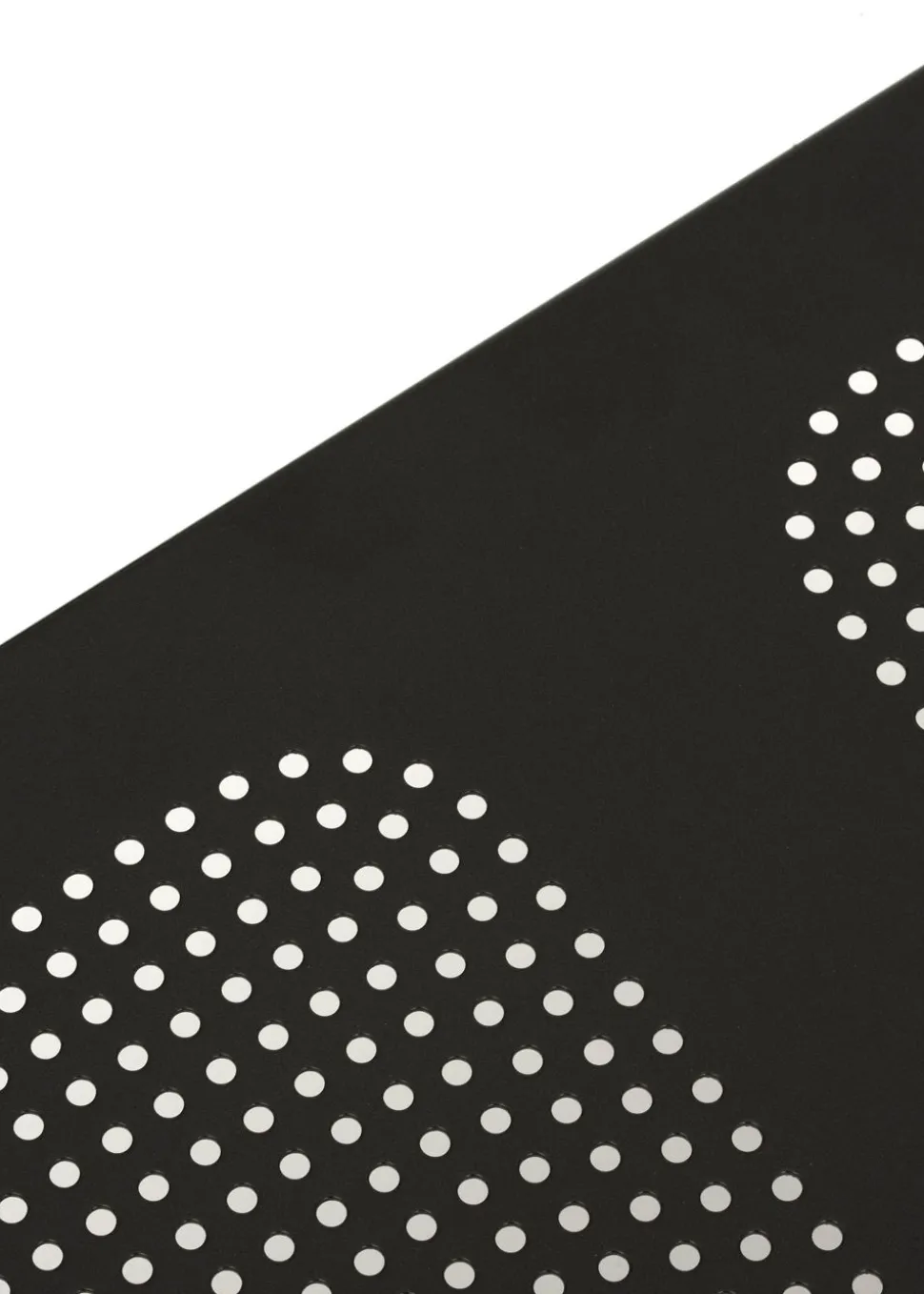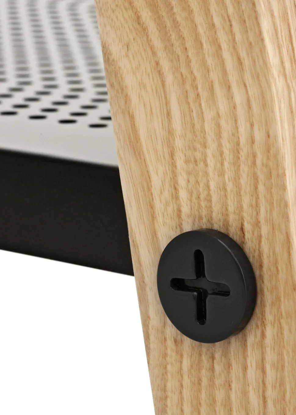 Simon Legald hat in dieser minimalistischen Konstruktion aus Skelett, Hängeschiene und Regal bis auf die Knochen geschnitten. Schrauben und Bolzen werden betont und die Löcher im Design des Regals werfen kreative Schatten auf den Boden.