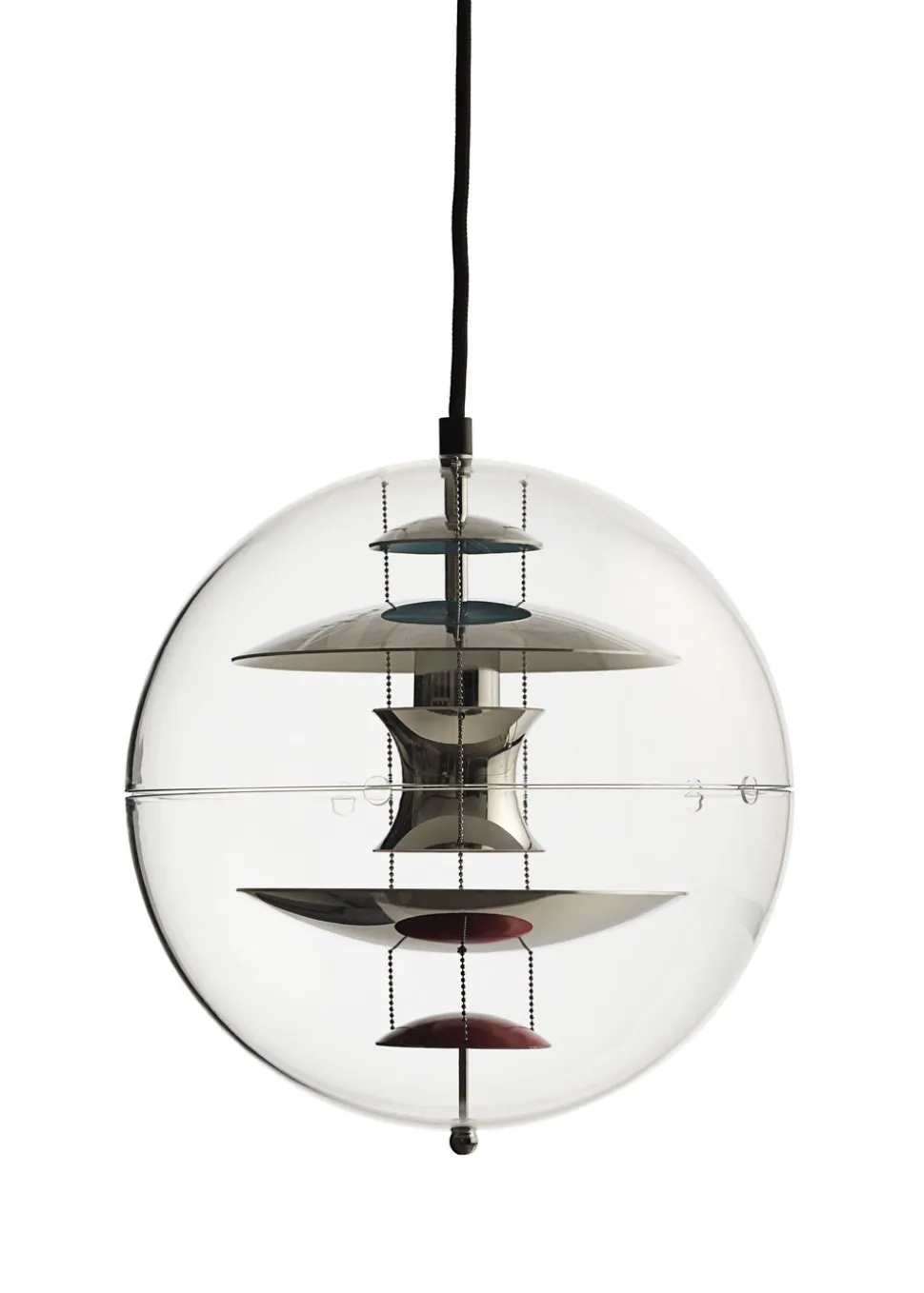 Erleben Sie zeitlose Eleganz mit der VP Globe Ø28 von , einem atemberaubenden Beleuchtungsmeisterwerk, das 1969 von dem Visionär entworfen wurde. Die VP Globe mini hat eine äußere Kugel aus kristallklarem, transparentem Acryl, die Raffinesse und Raffinement ausstrahlt. Im Inneren strahlen fünf Innenreflektoren, die elegant an drei Stahlketten aufgehängt sind, ein warmes und einladendes Licht aus, das einen faszinierenden Tanz des Lichts in alle Richtungen erzeugt.