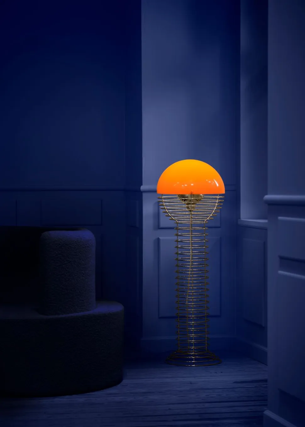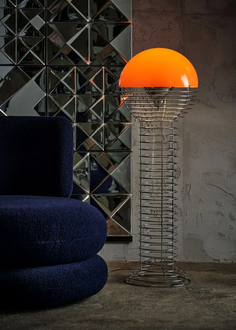 Die Draht-Stehleuchte wurde 1980 von Verner Planton entworfen. Der Rahmen hat eine zylindrische Form, die sich oben in eine Halbkugel ausdehnt. Der Rahmen ist aus verchromtem Stahl und der Lampenschirm aus Kunststoff.