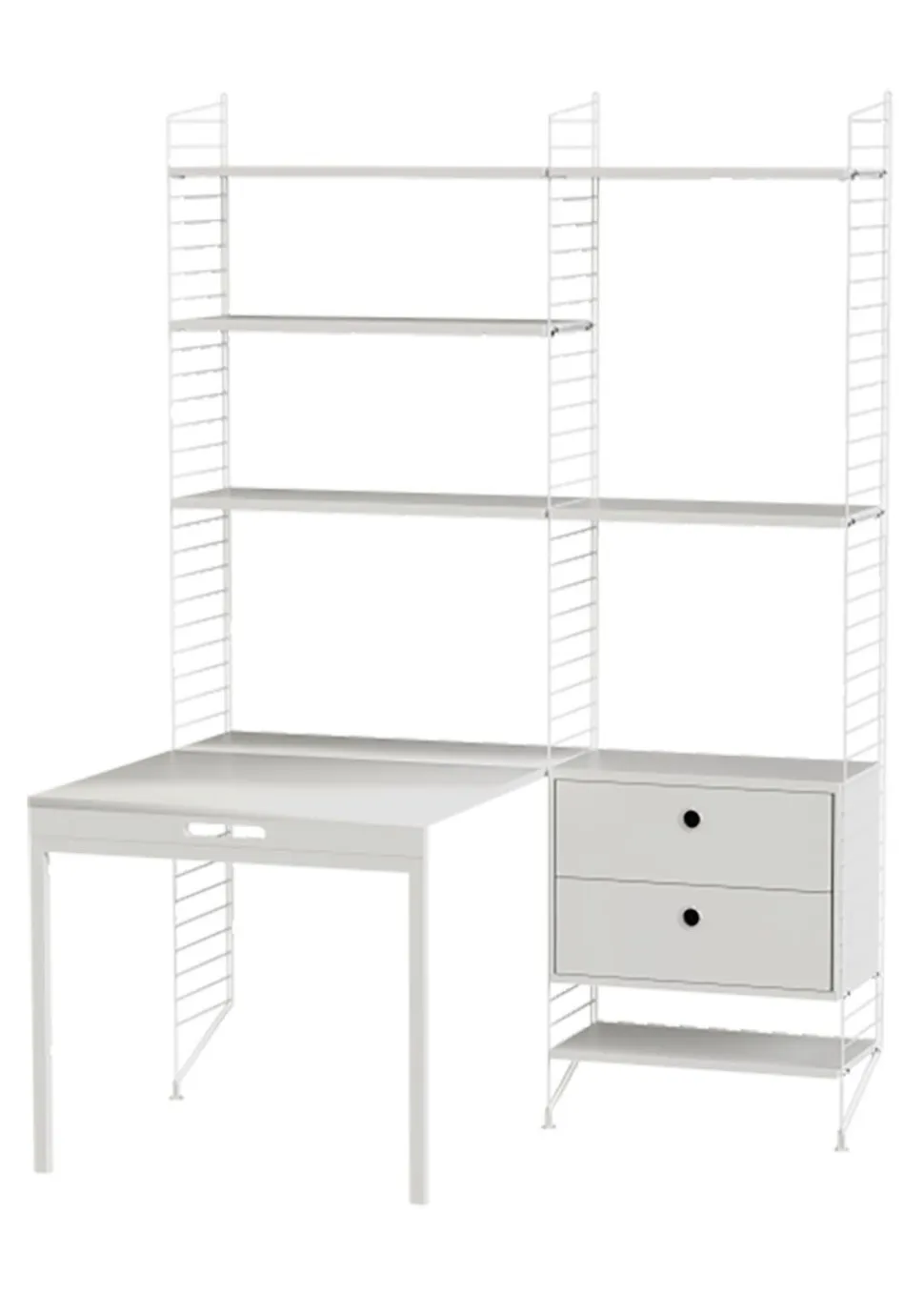 - Bestandteile: 1 x 2er-Pack Bodenplatte h200 x d30 cm | 1 x Bodenplatte h200 x d30 cm | 1 x 3er-Pack Regal b58 x d30 cm | 1 x 3er-Pack Regal b78 x d30 cm | 1 x Klapptisch | 1 x Schrank mit zwei Schubladen b58 x t30 x h42 cm.